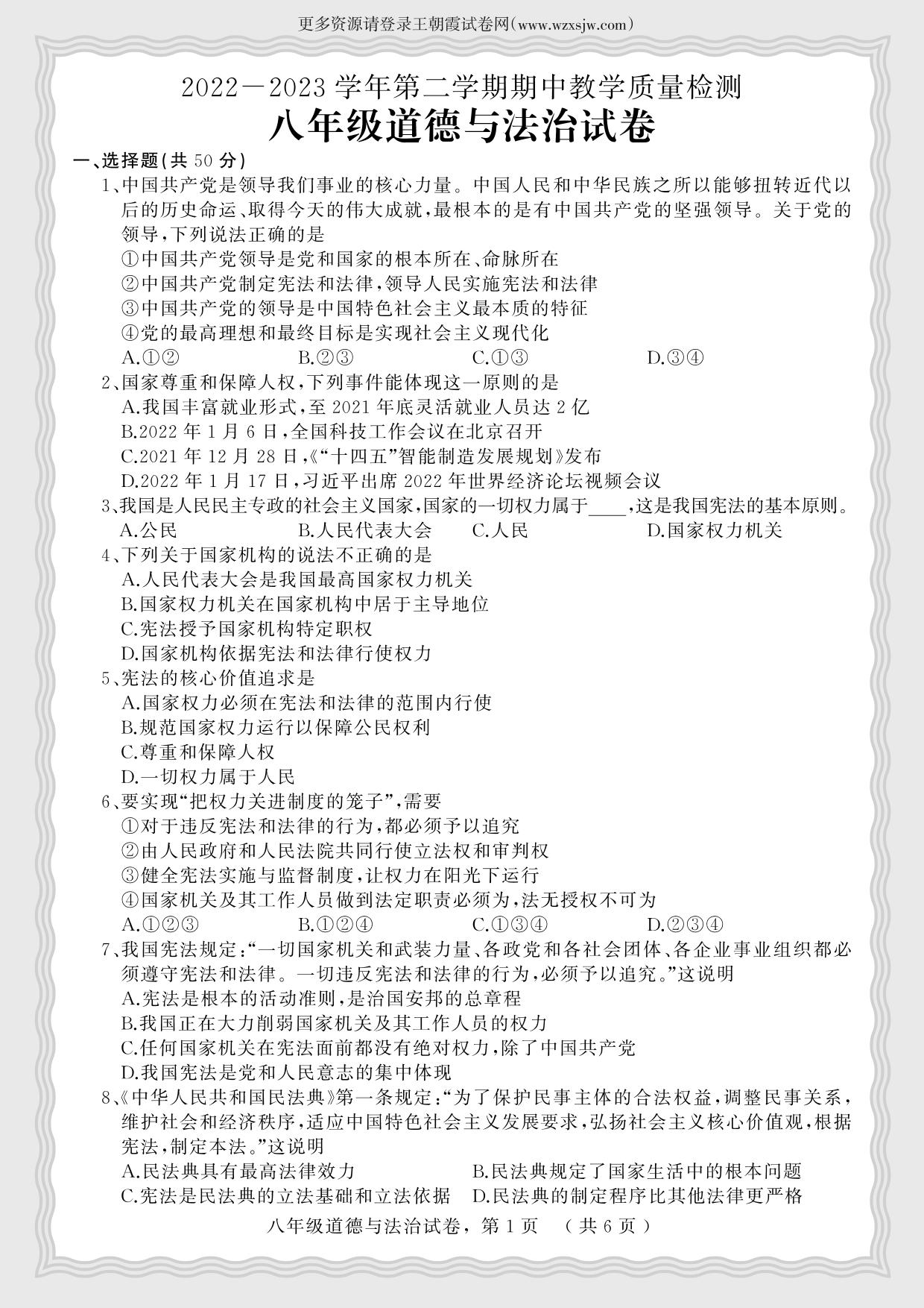 八年级道德与法治人教版下册期中卷