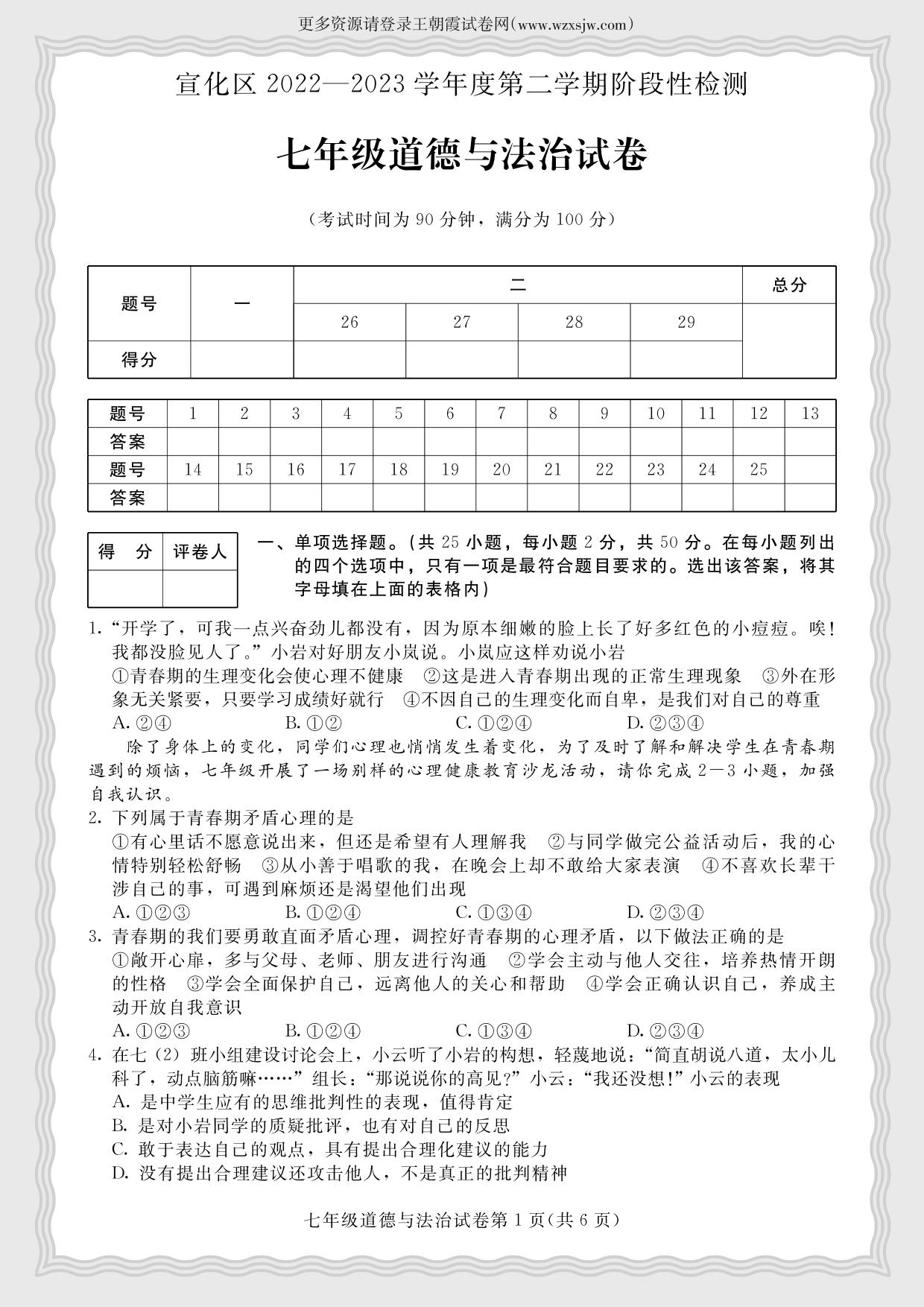河北省张家口市宣化区2022-2023学年度第二学期期中阶段性检测试卷七年级道德与法治(人教版)