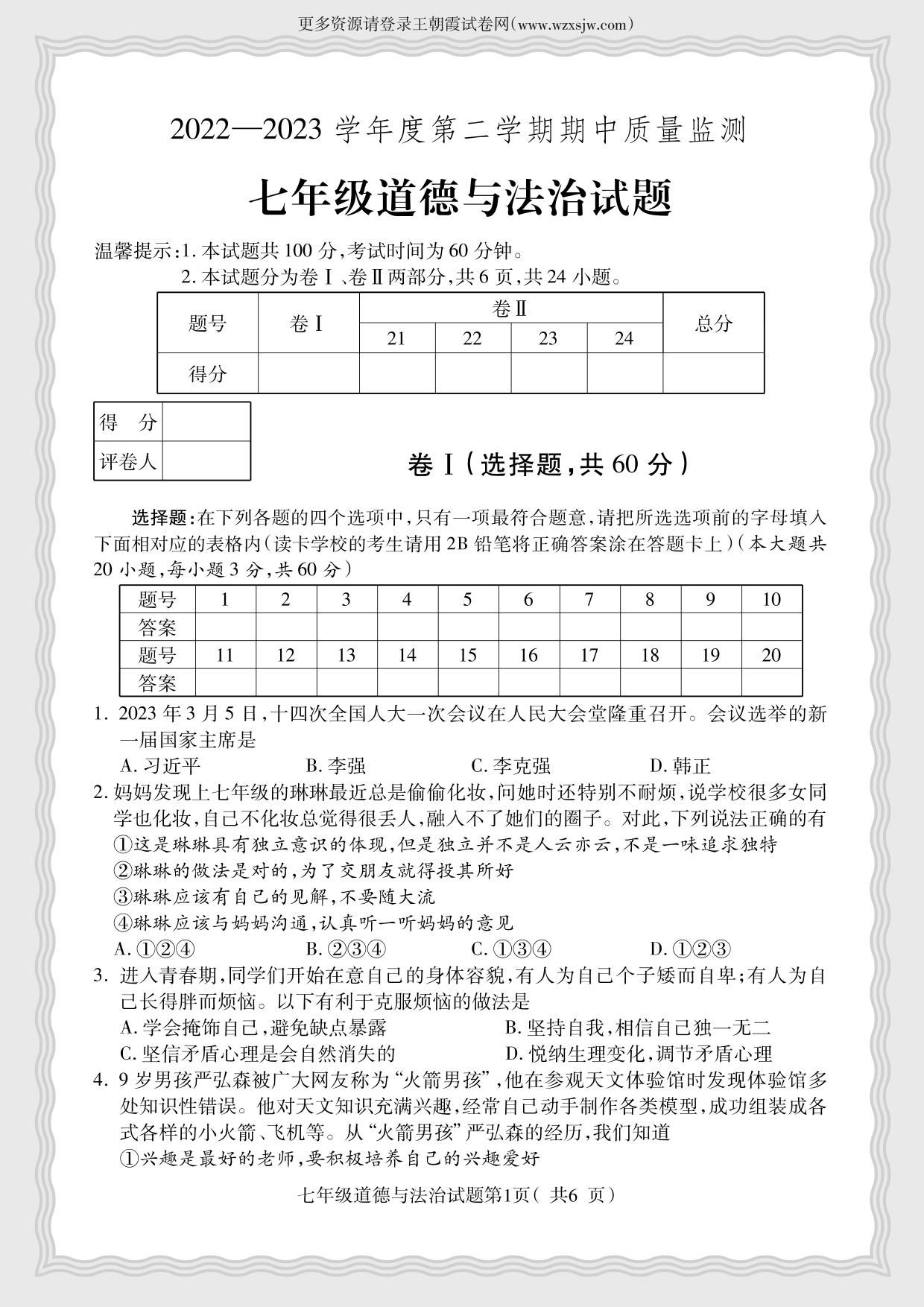 河北省保定市定州市2022-2023学年第二学期期中质量监测试题七年级道德与法治(人教版)