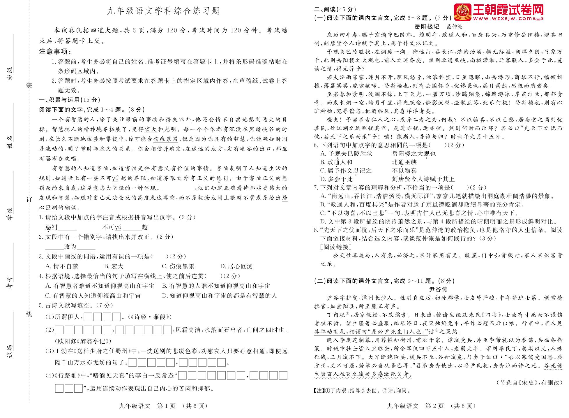 九年级语文人教版下册月考卷