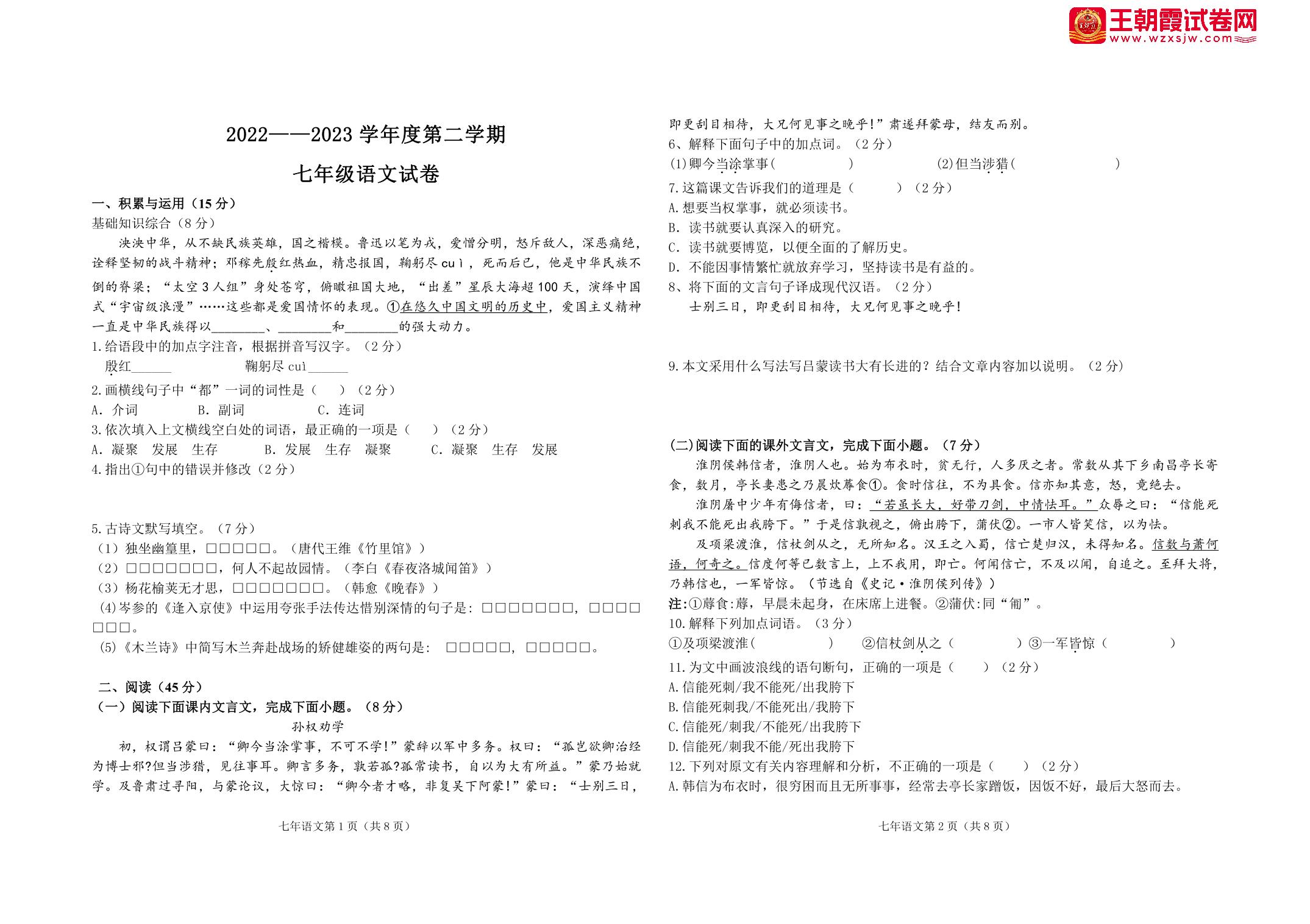 吉林省长春市德惠市第三中学2022-2023学年下学期第一次月考试卷七年级语文(人教版)
