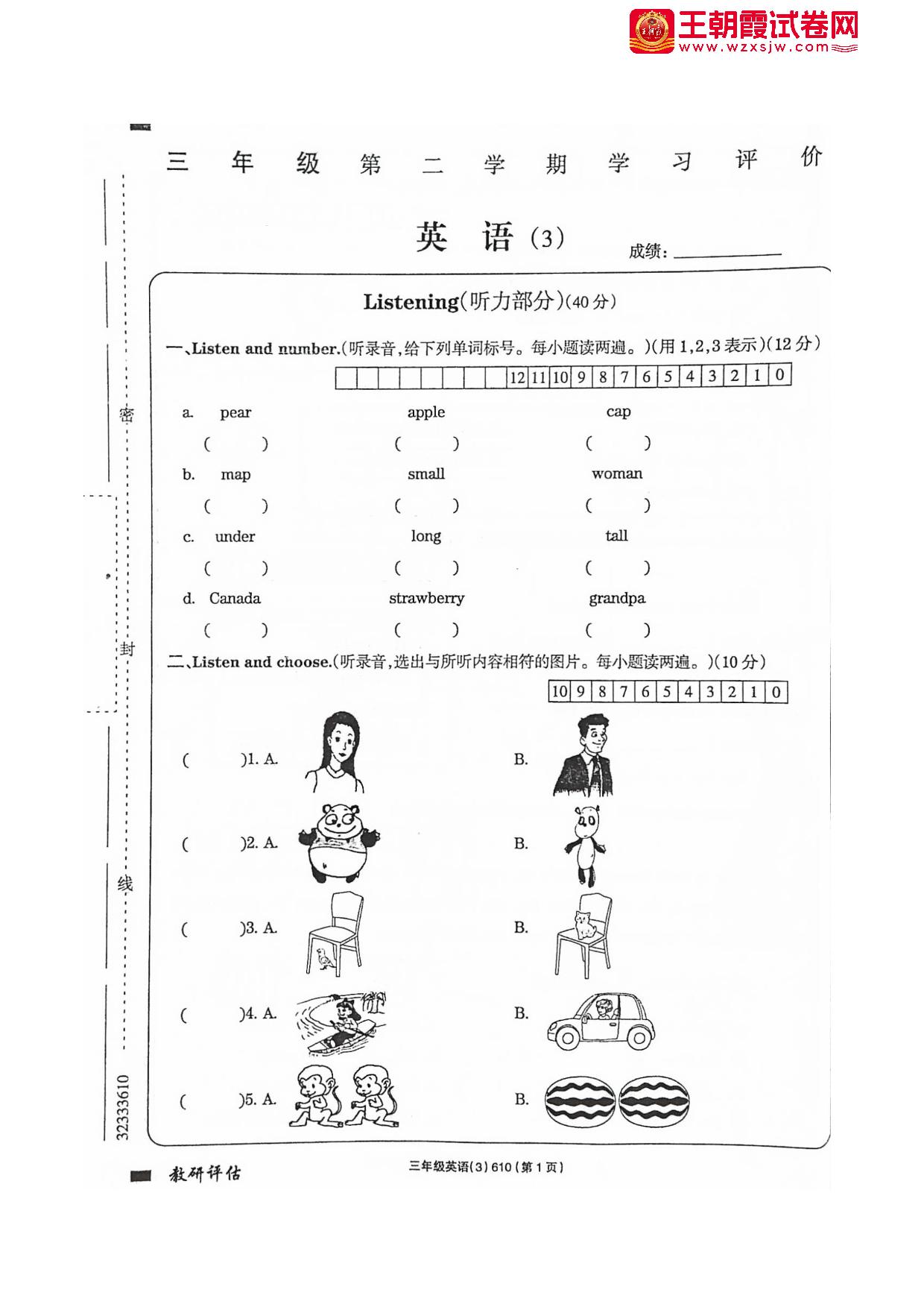 三年级英语人教PEP版(三起始)下册月考卷