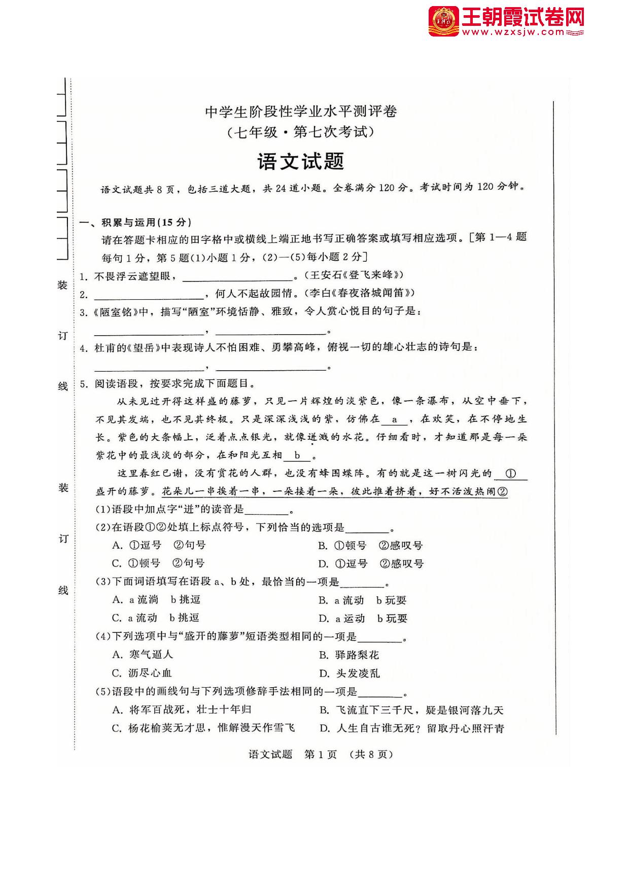 吉林省白城市通榆县2022-2023学年下学期5月月考试卷七年级语文(人教版)