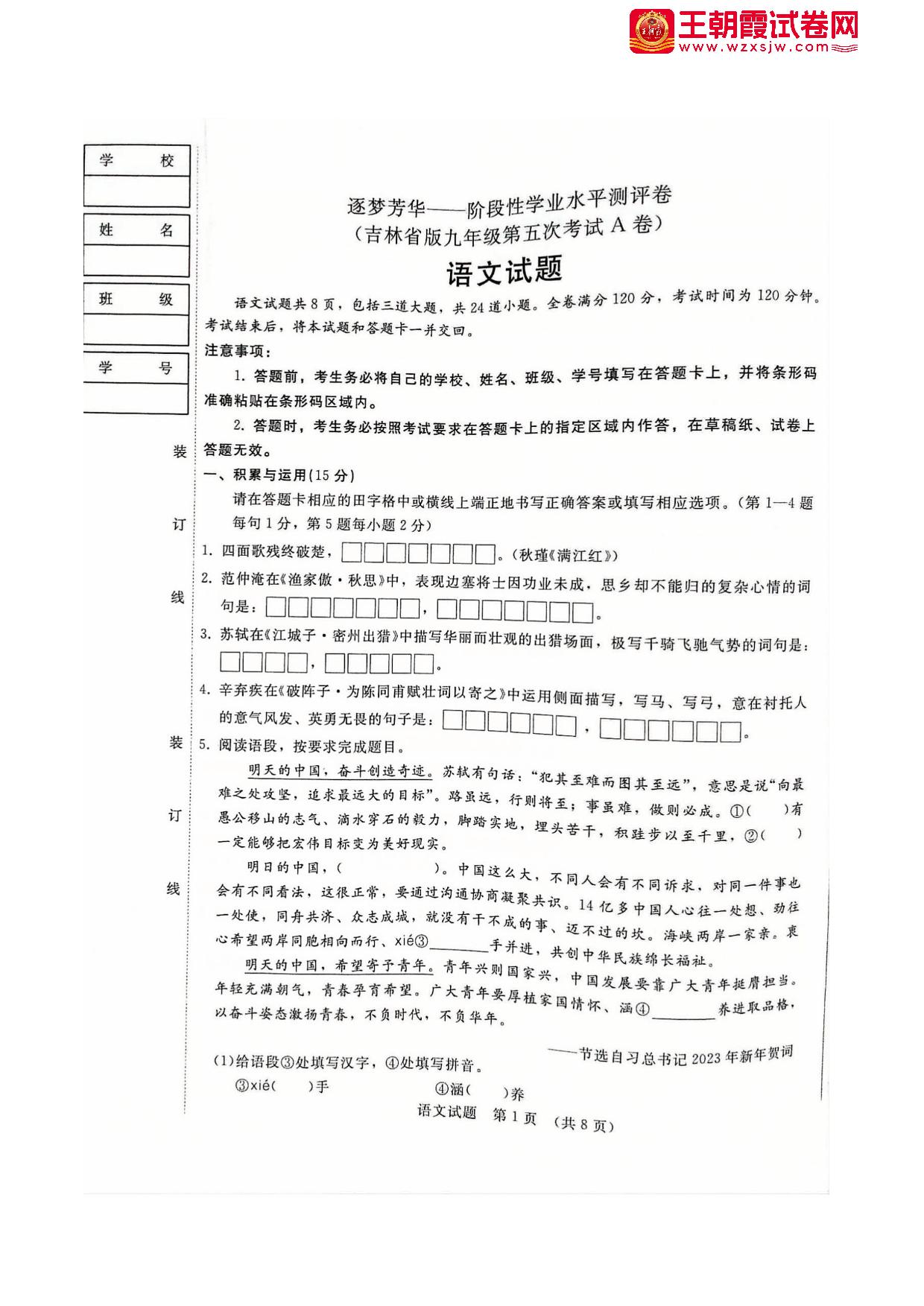 吉林省白城市通榆县2022-2023学年下学期3月月考试卷九年级语文(人教版)