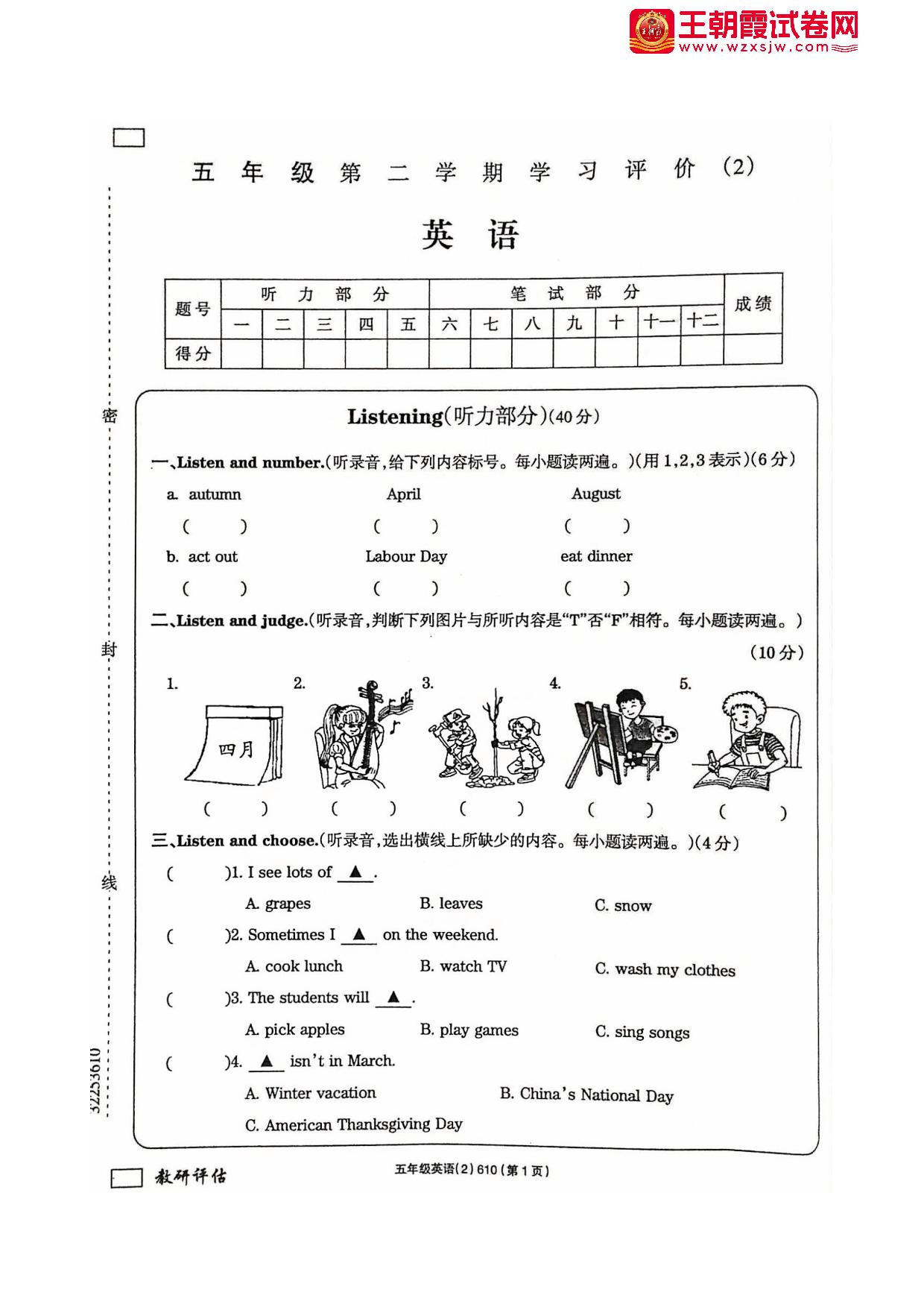 吉林省白城市通榆县育才学校2022-2023学年下学期期中考试试卷五年级英语(PEP版)