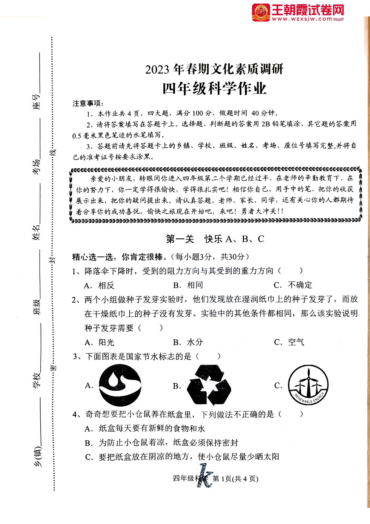 河南省南阳市西峡县2022—2023学年下学期4月期中试题四年级科学(教科版)