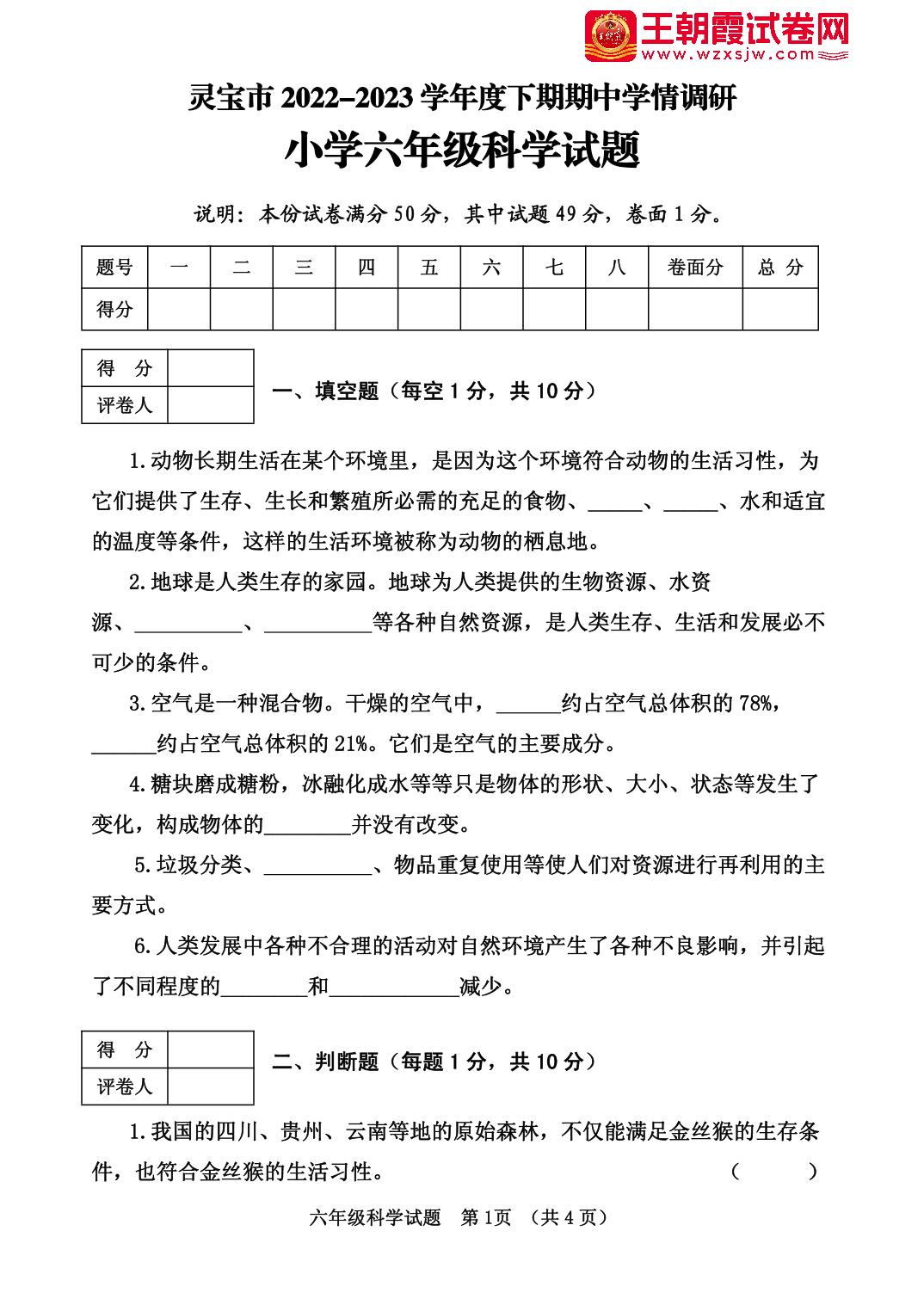 河南省三门峡市灵宝市2022—2023学年下学期期中学情调研试题六年级科学(大象版)