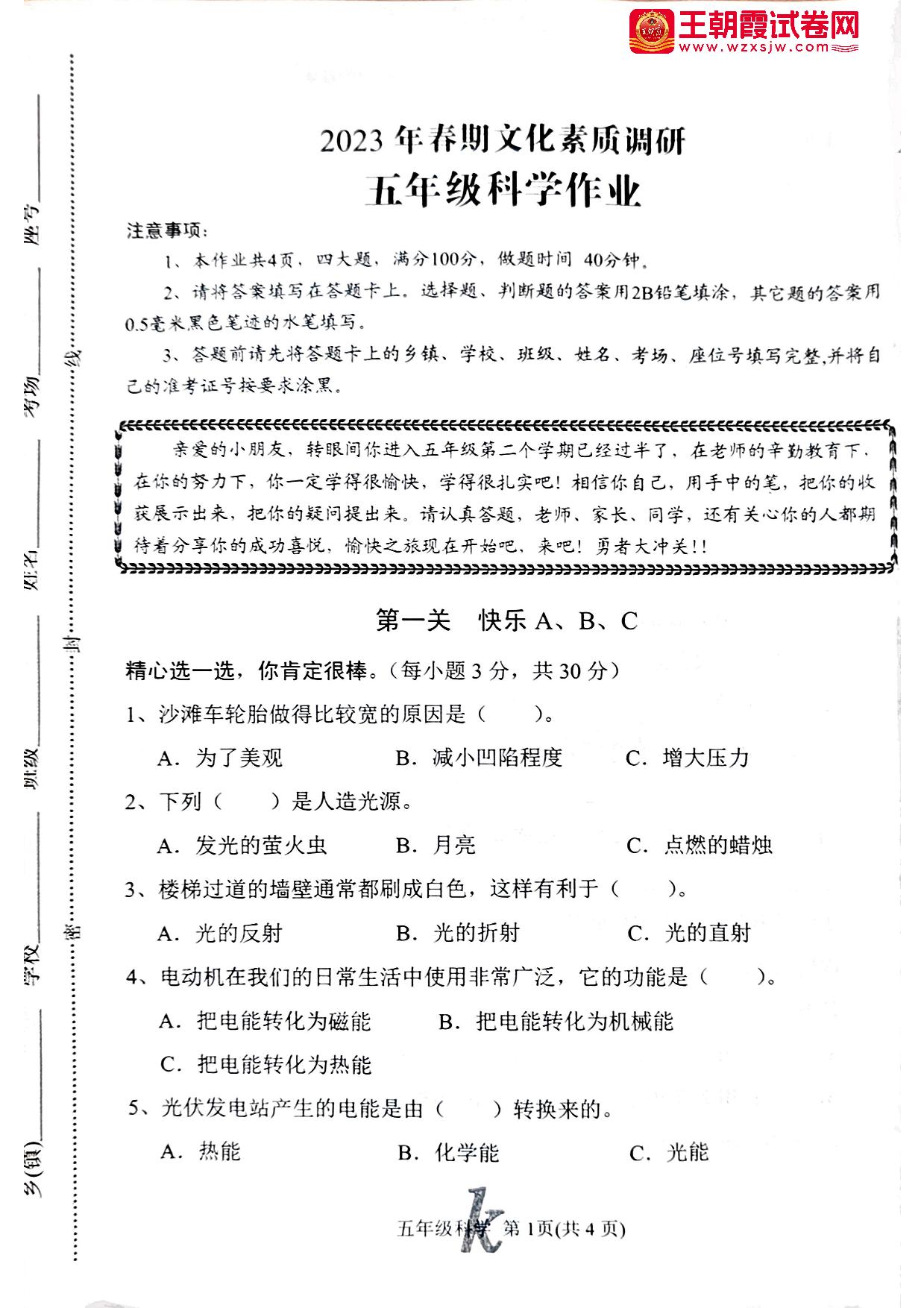 河南省南阳市西峡县2022—2023学年下学期4月期中试题五年级科学(教科版)