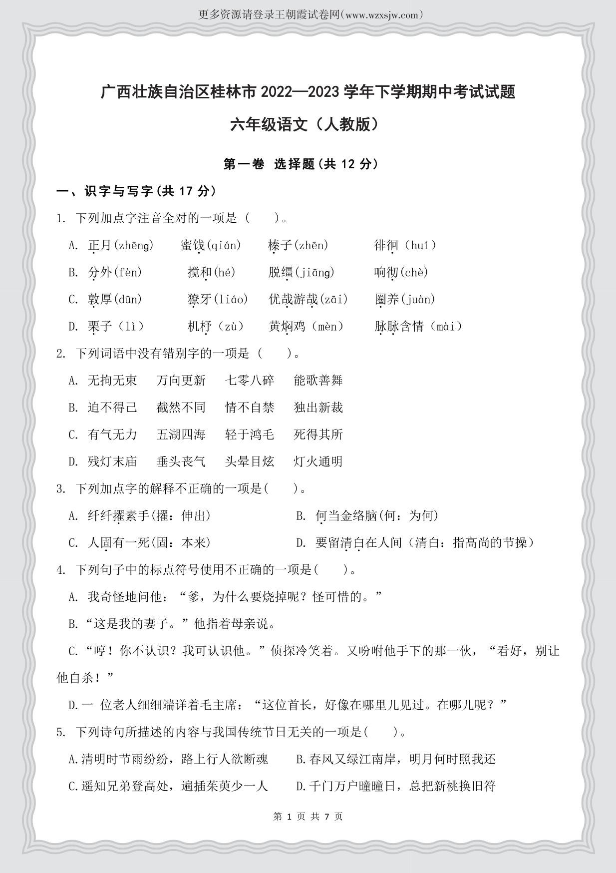 广西壮族自治区桂林市2022—2023学年下学期期中考试试题六年级语文(人教版)