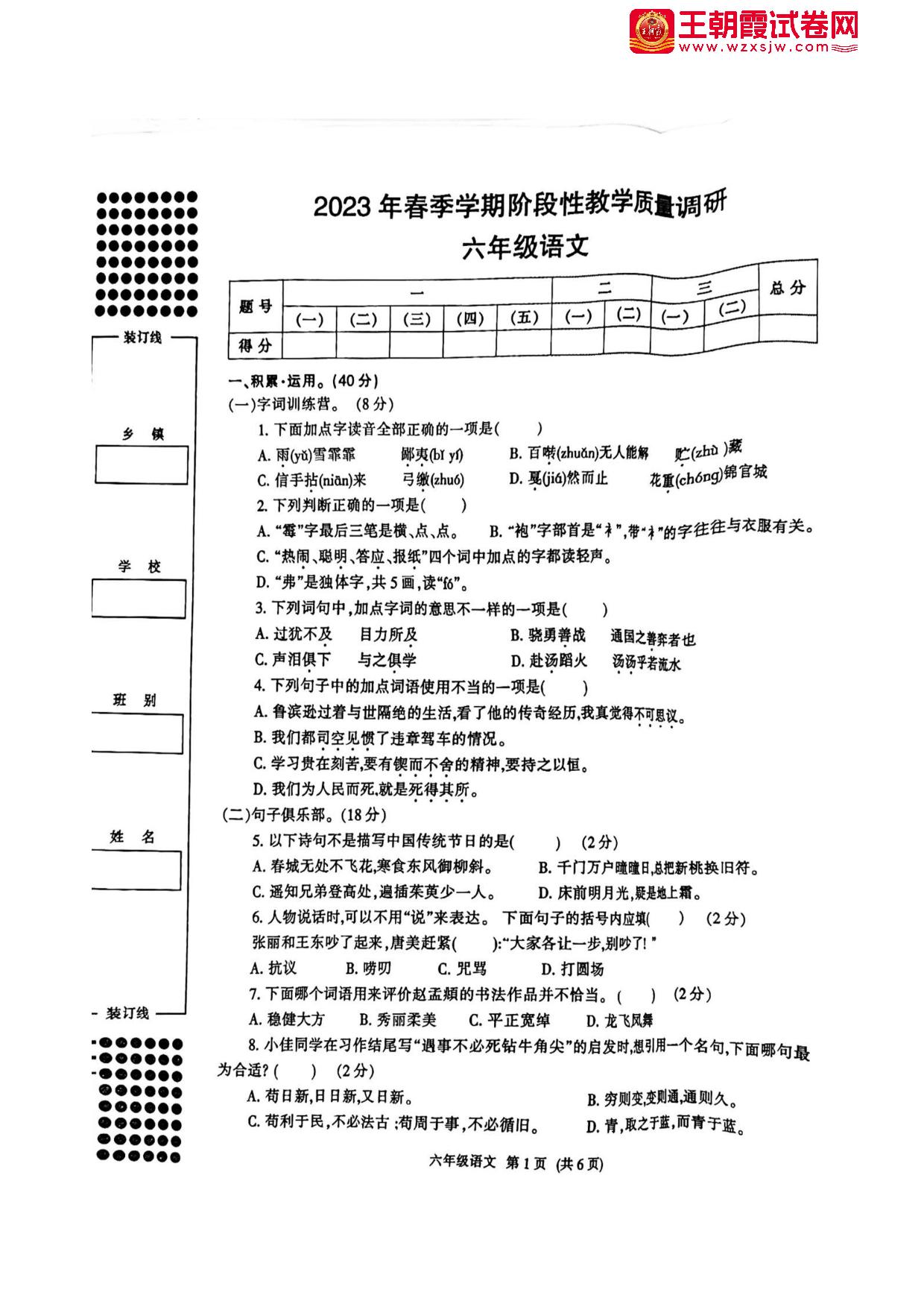 六年级语文人教版下册期中卷
