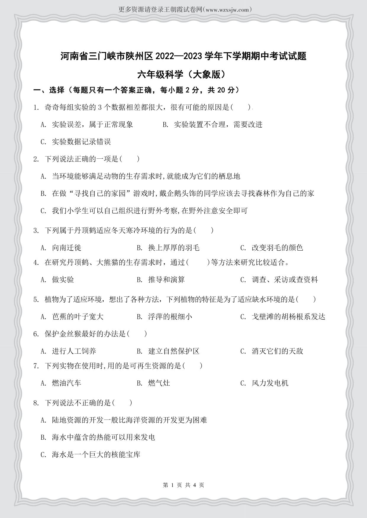 河南省三门峡市陕州区2022—2023学年下学期期中考试试题六年级科学(大象版)