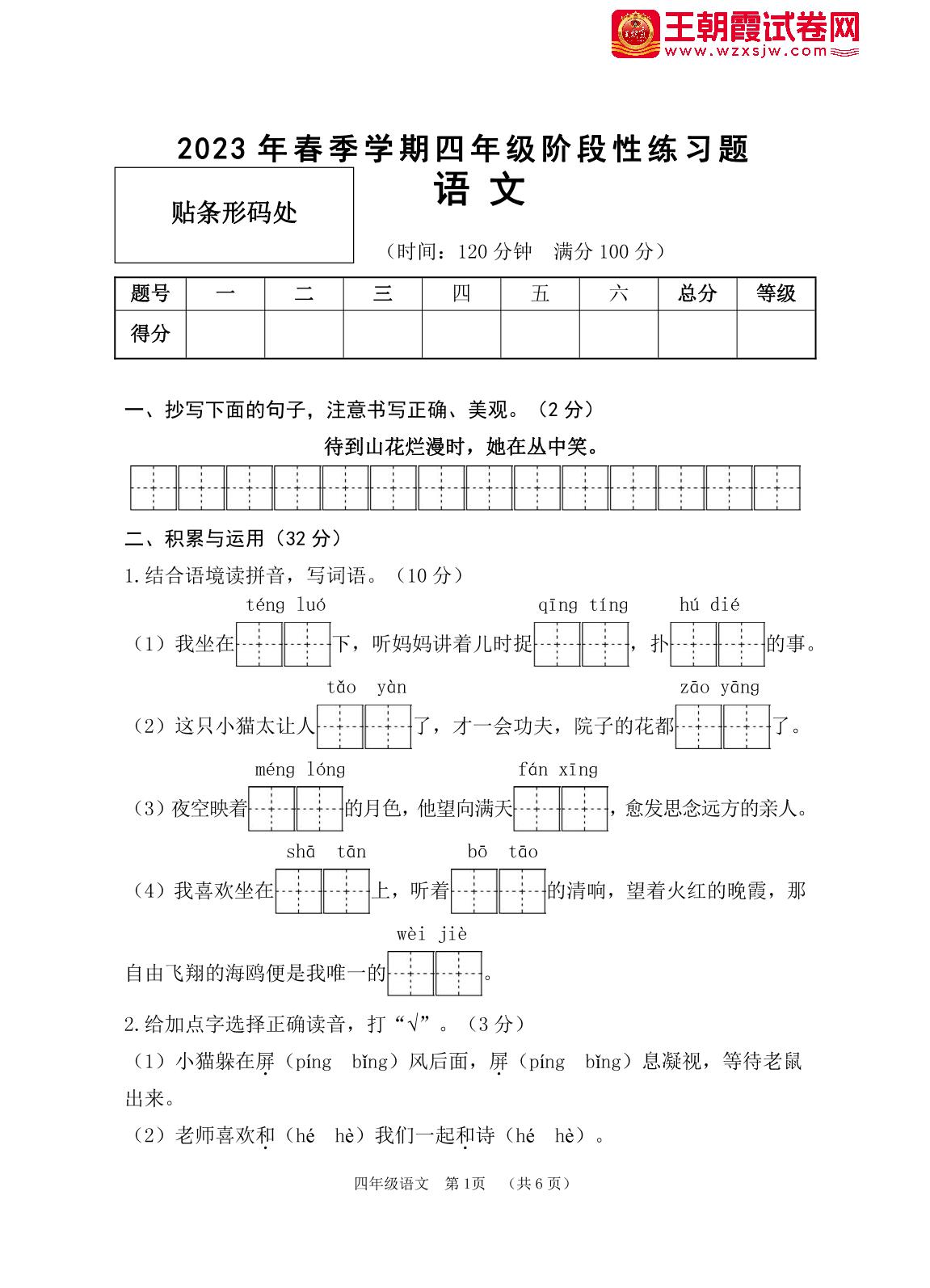 广西贺州市八步区2022—2023学年下学期期中阶段性练习题四年级语文(人教版)