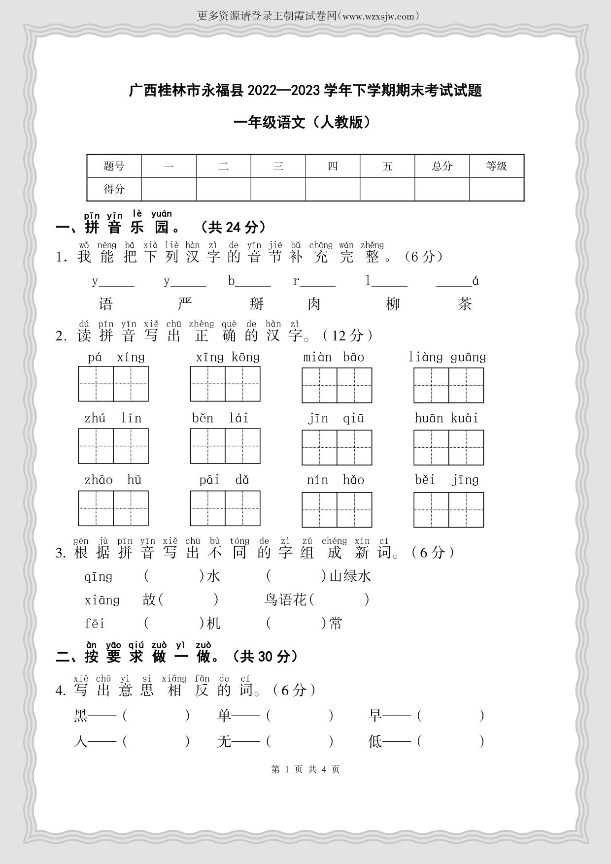 广西桂林市永福县2022—2023学年下学期期末考试试题一年级语文(人教版)