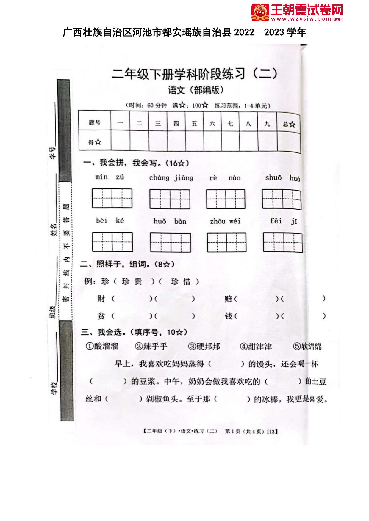 广西壮族自治区河池市都安瑶族自治县2022—2023学年下学期期中学科阶段性练习二年级语文(人教版)
