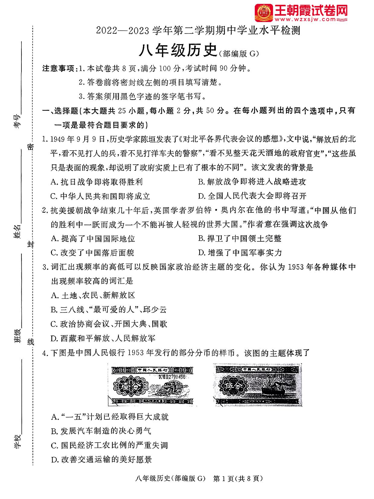 河北省保定市高碑店市2022-2023学年第二学期期中学业水平检测八年级历史(人教版)