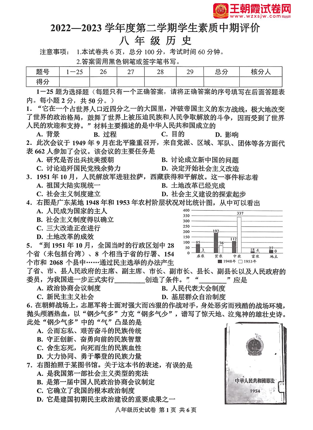 八年级历史人教版下册期中卷