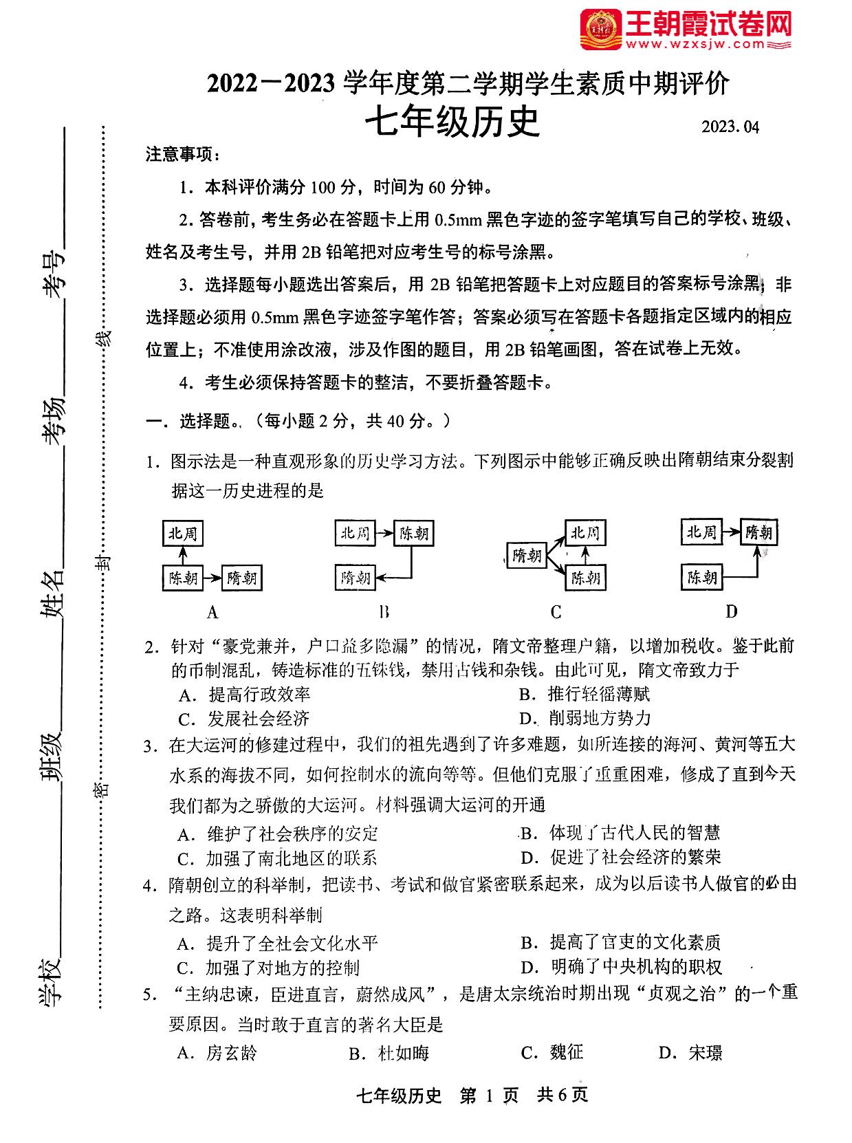 河北省唐山市路北区2022-2023学年度第二学期学生素质中期评价试卷七年级历史(人教版)