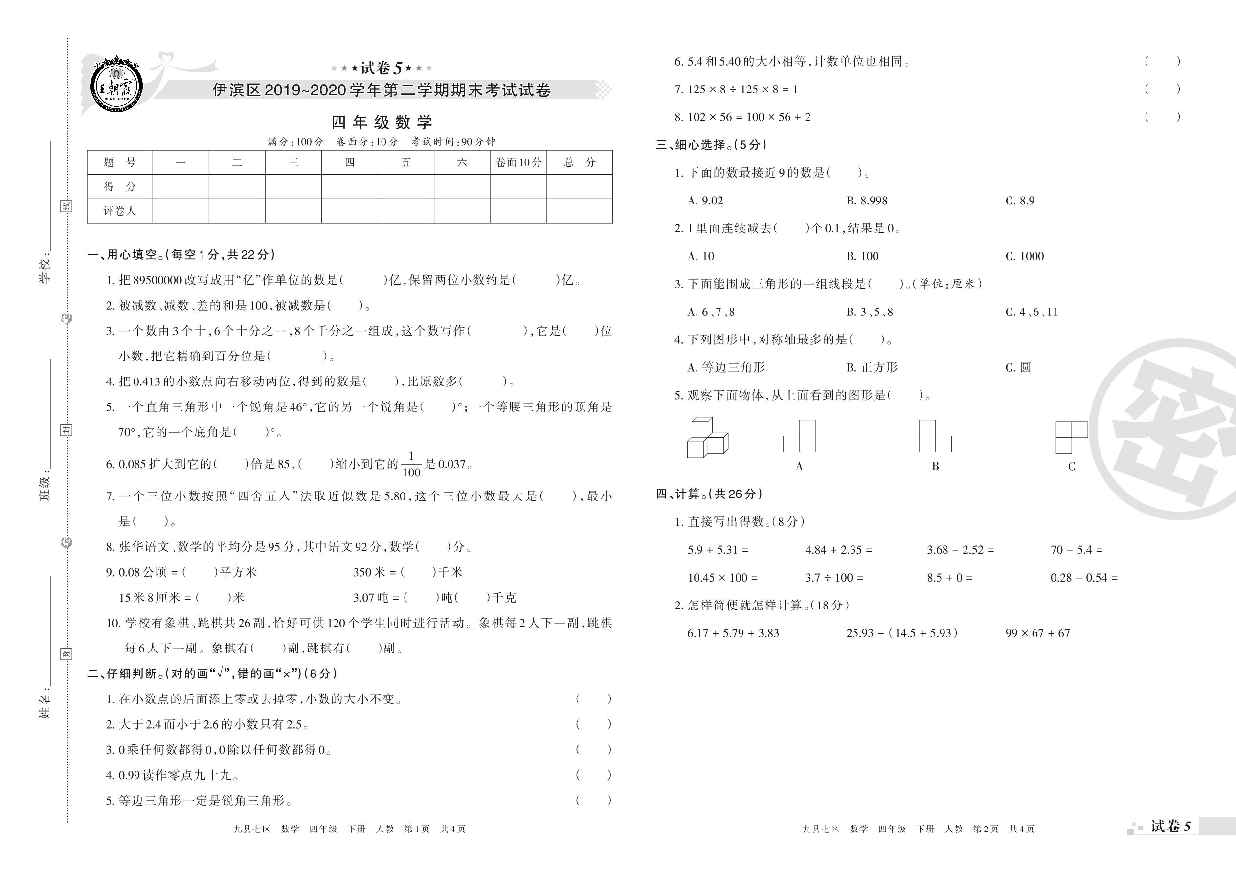 2019-2020学年第二学期洛阳市伊滨区四年级数学试卷(人教版)【5】