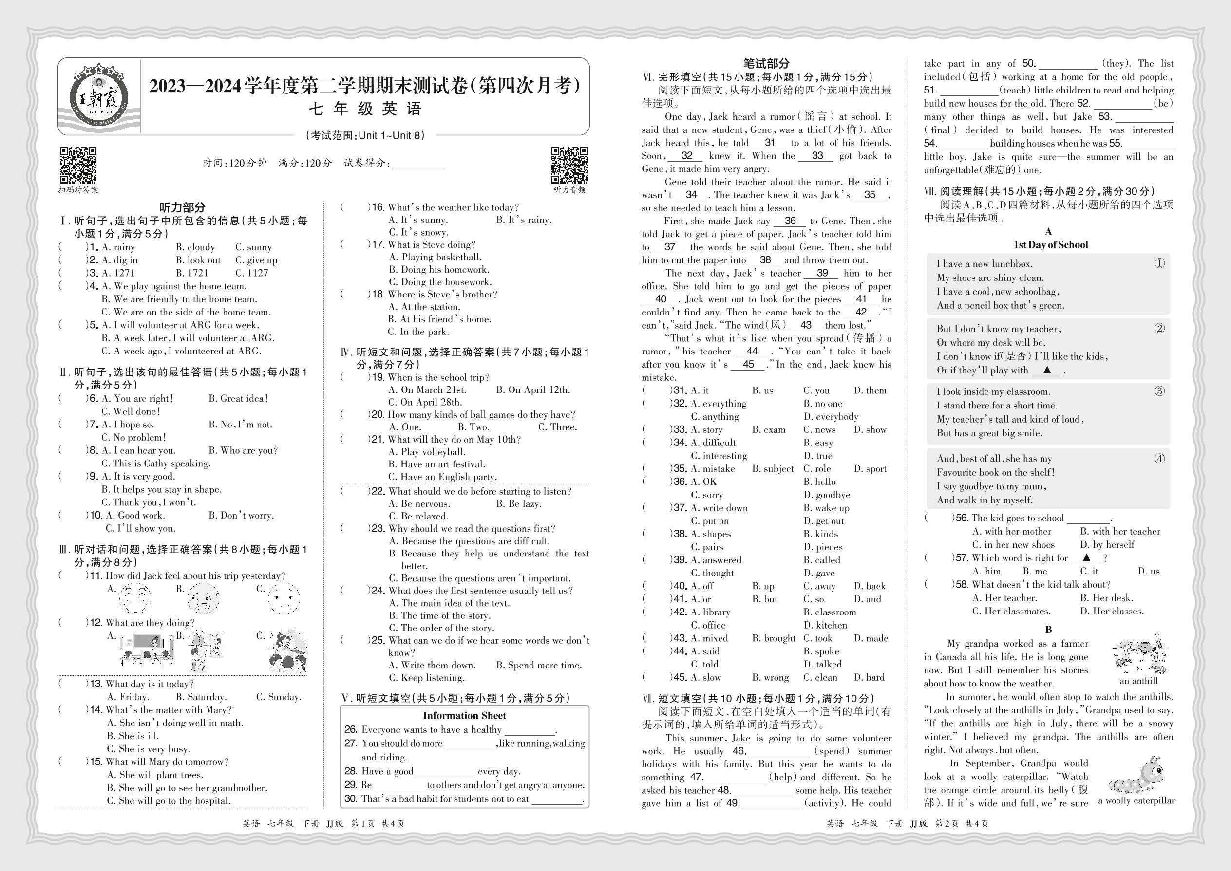 2023—2024学年度第二学期期末测试卷(第四次月考)七年级英语(冀教版)