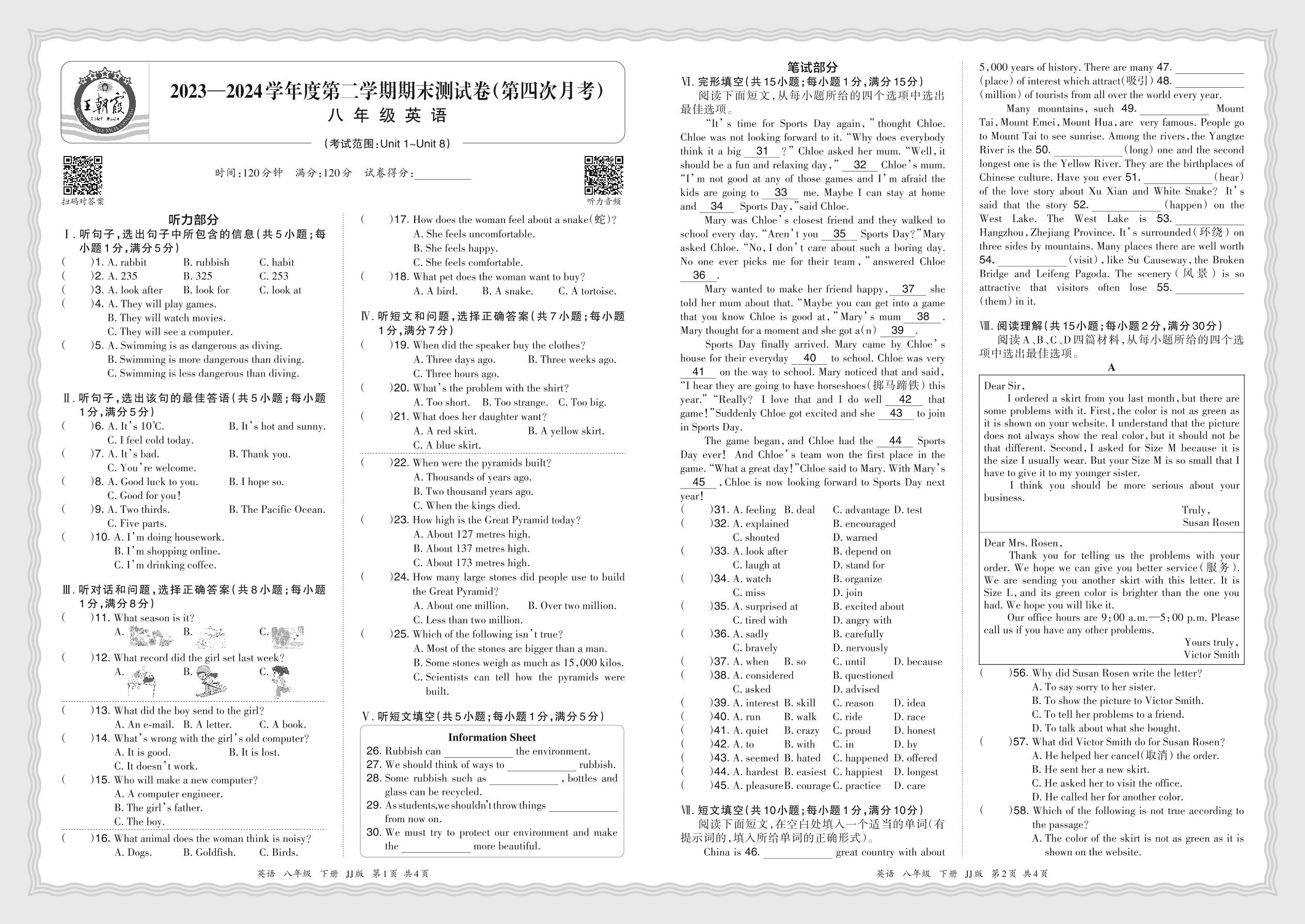 2023—2024学年度第二学期期末测试卷(第四次月考)八年级英语(冀教版)