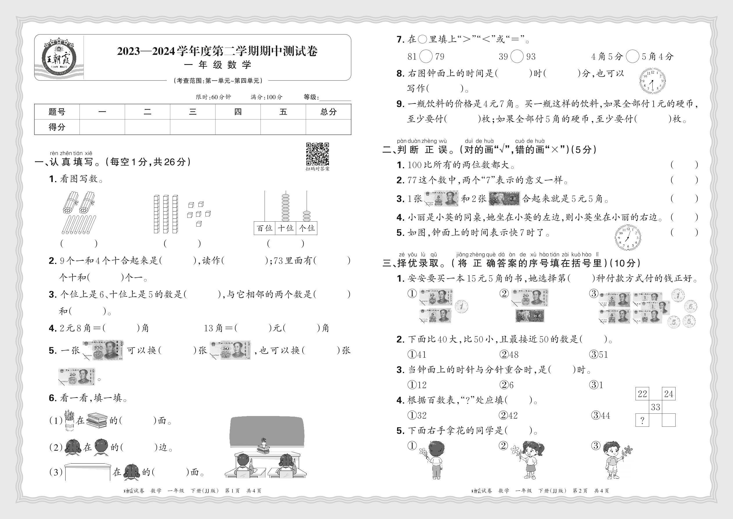 2023—2024学年度第二学期期中测试卷一年级数学(冀教版)