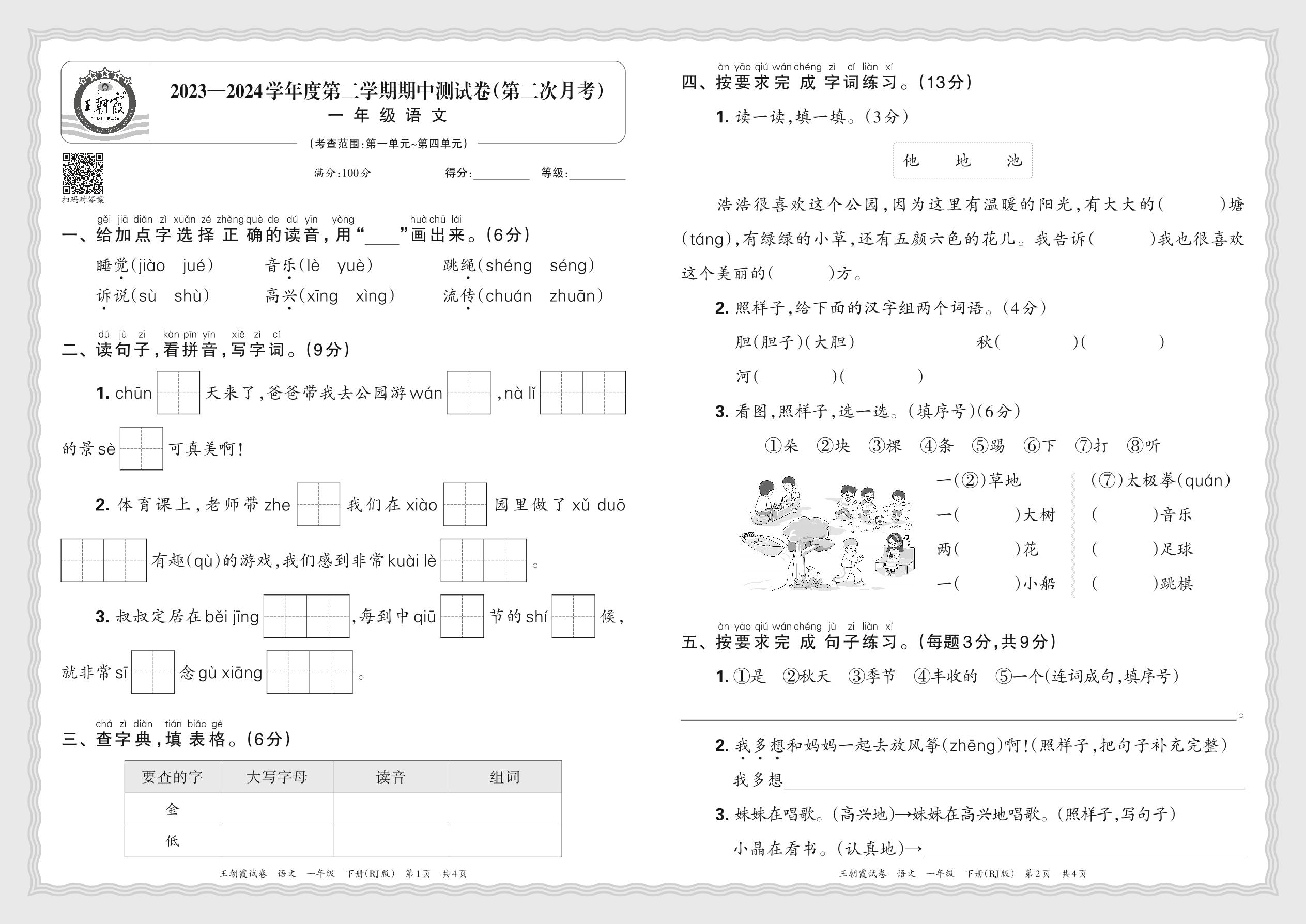2023—2024学年度第二学期期中测试卷(第二次月考)一年级语文(人教版)