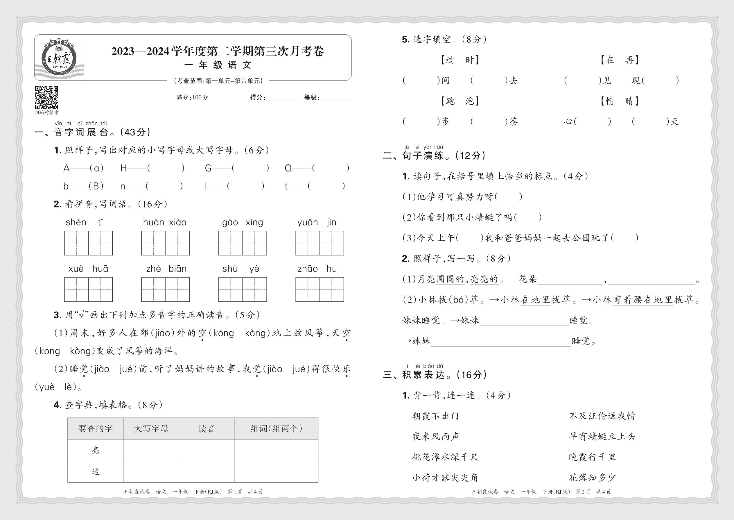2023—2024学年度第二学期第三次月考卷一年级语文(人教版)