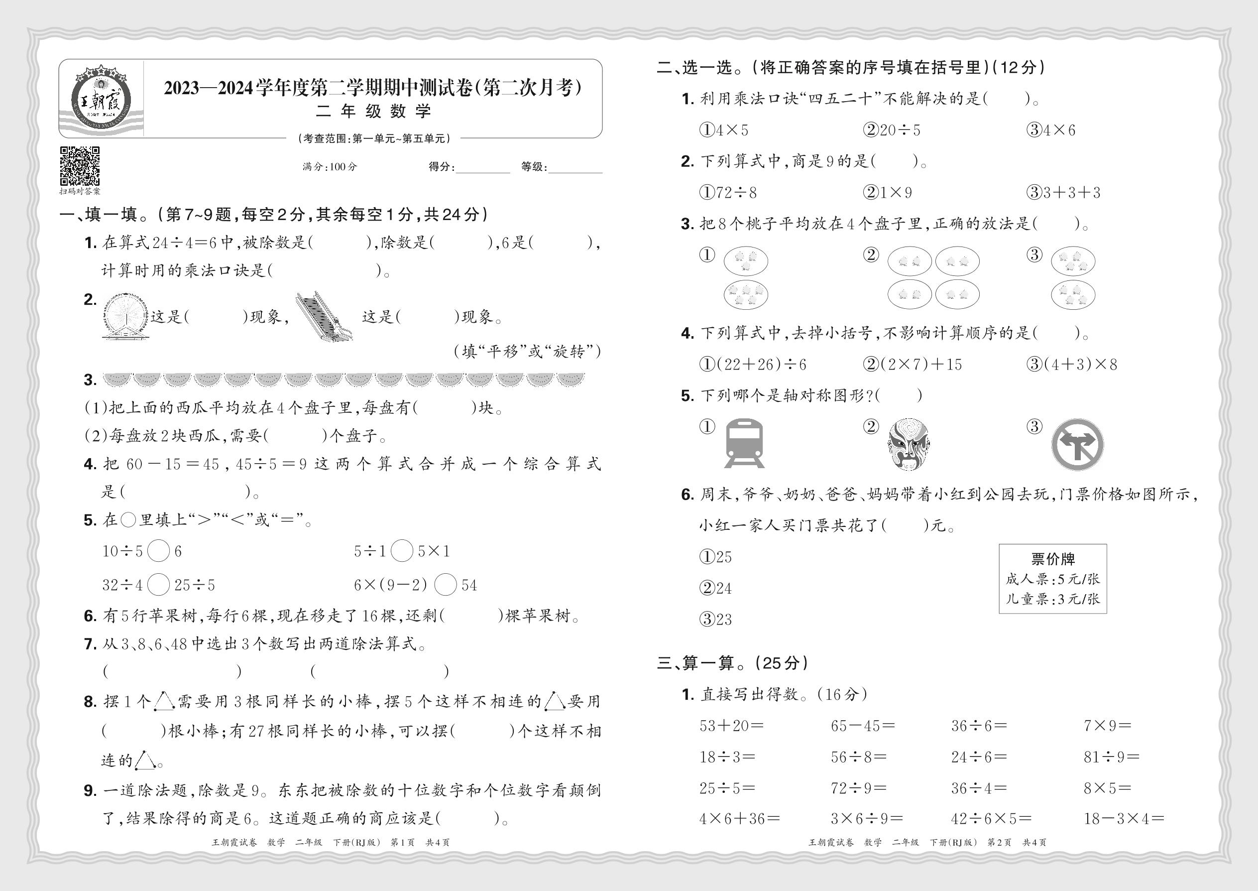 2023—2024学年度第二学期期中测试卷(第二次月考)二年级数学(人教版)