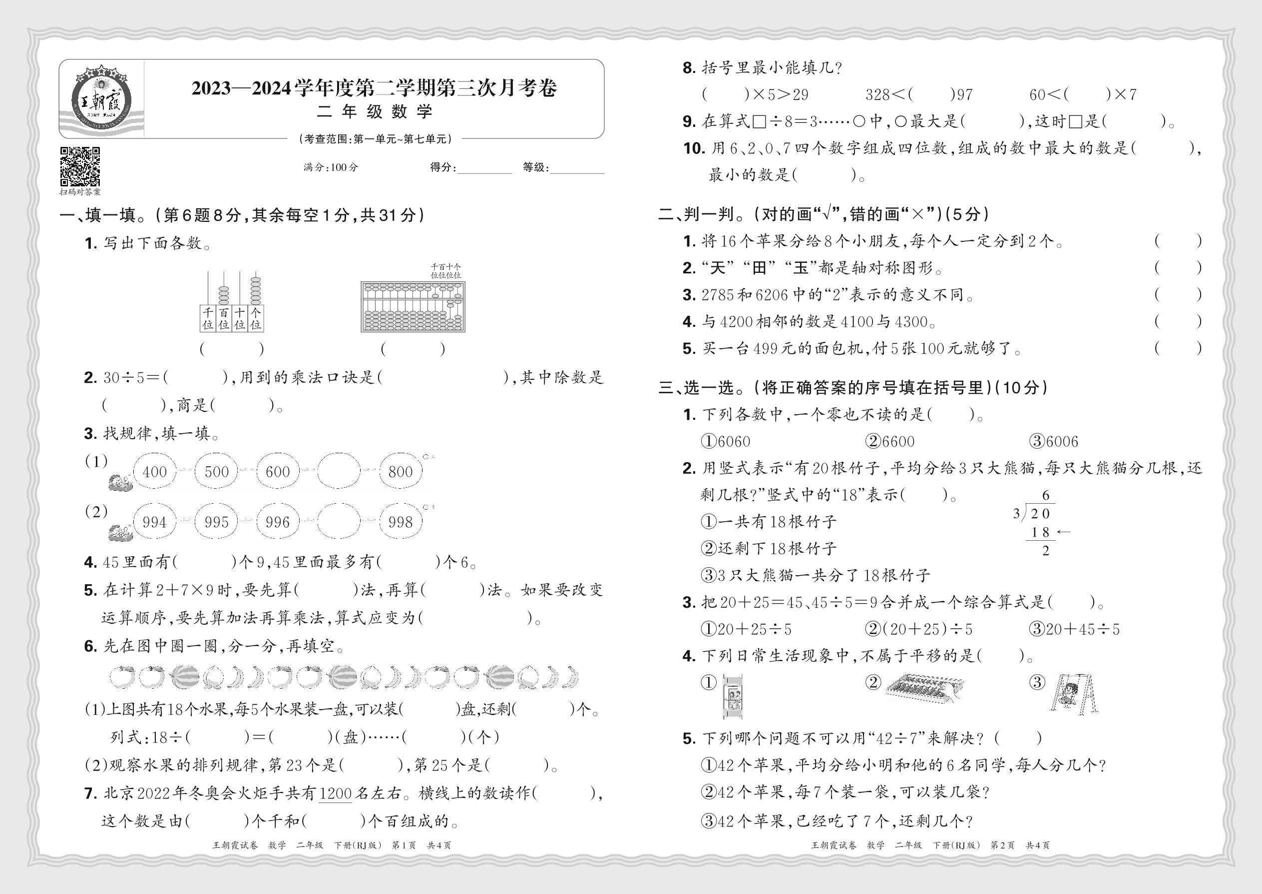 2023—2024学年度第二学期第三次月考卷二年级数学(人教版)