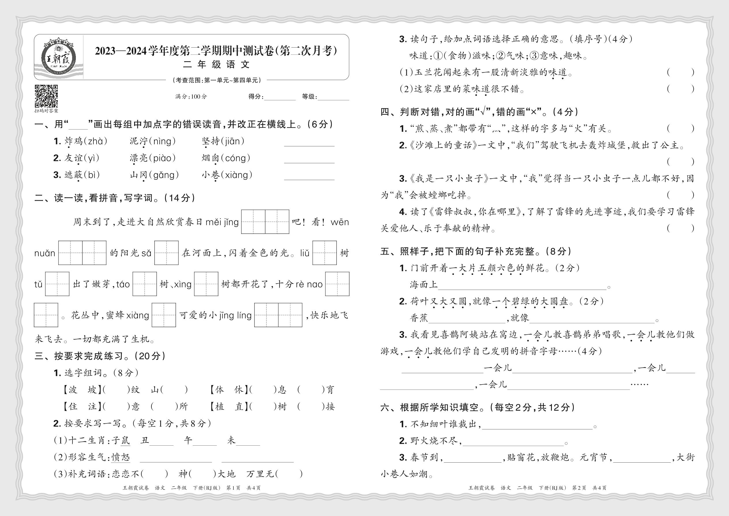 2023—2024学年度第二学期期中测试卷(第二次月考)二年级语文(人教版)