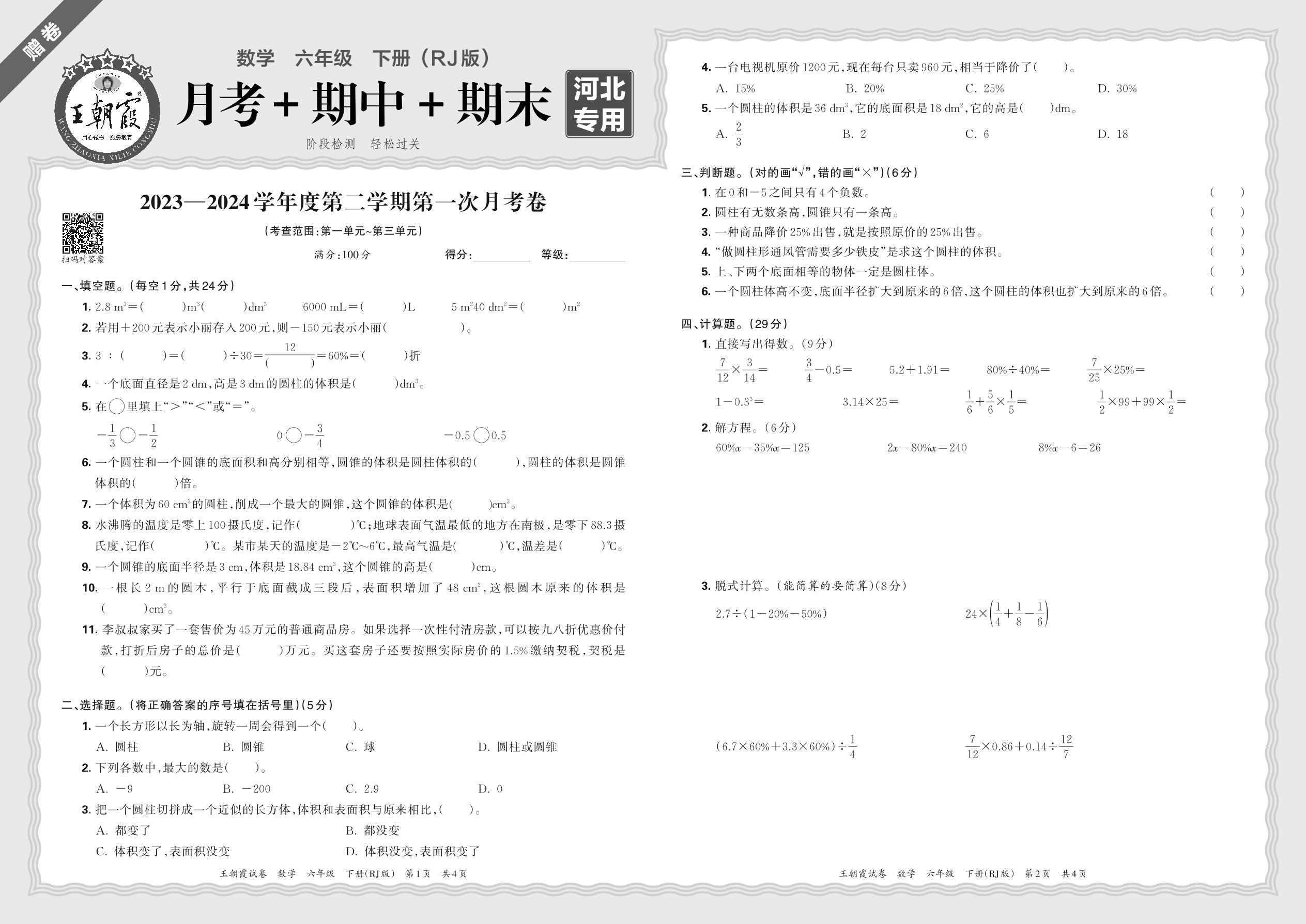 2023—2024学年度第二学期第一次月考卷六年级数学(人教版)