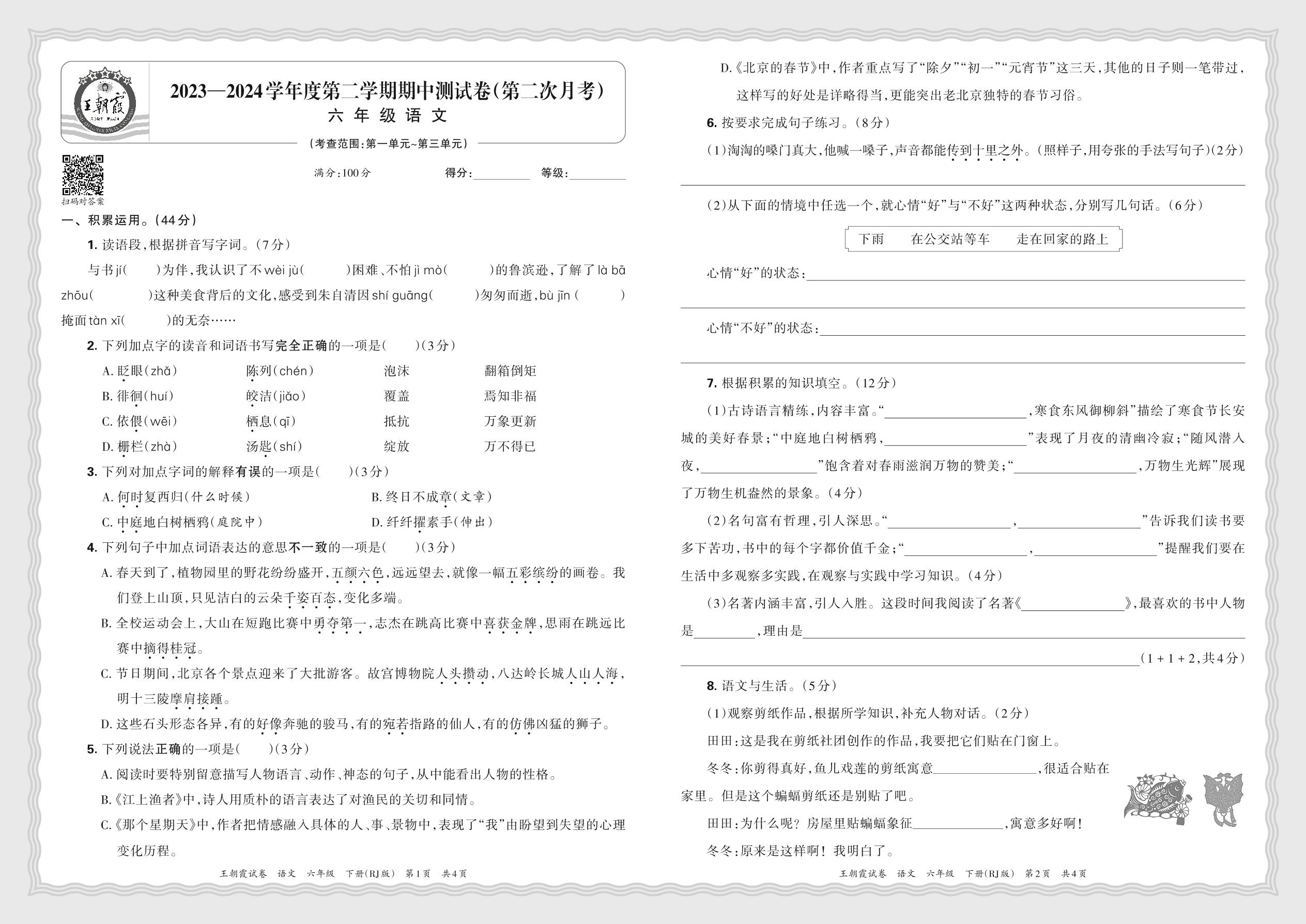 2023—2024学年度第二学期期中测试卷(第二次月考)六年级语文(人教版)