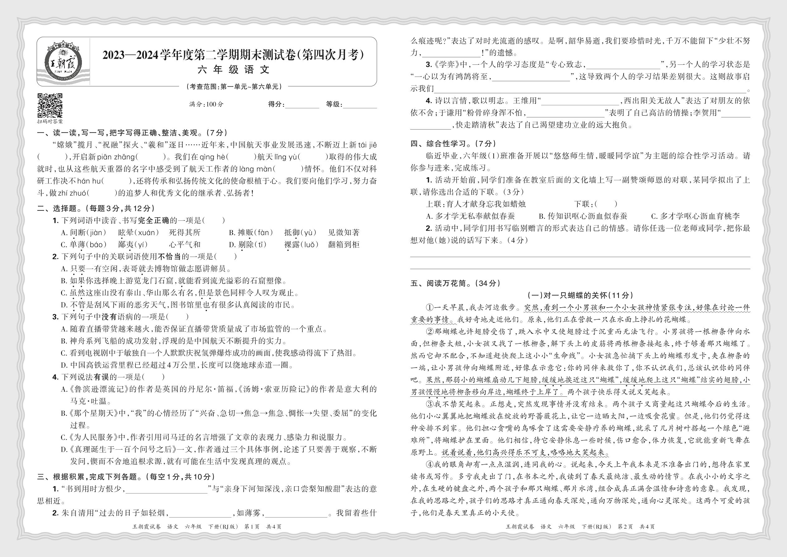 2023—2024学年度第二学期期末测试卷(第四次月考)六年级语文(人教版)