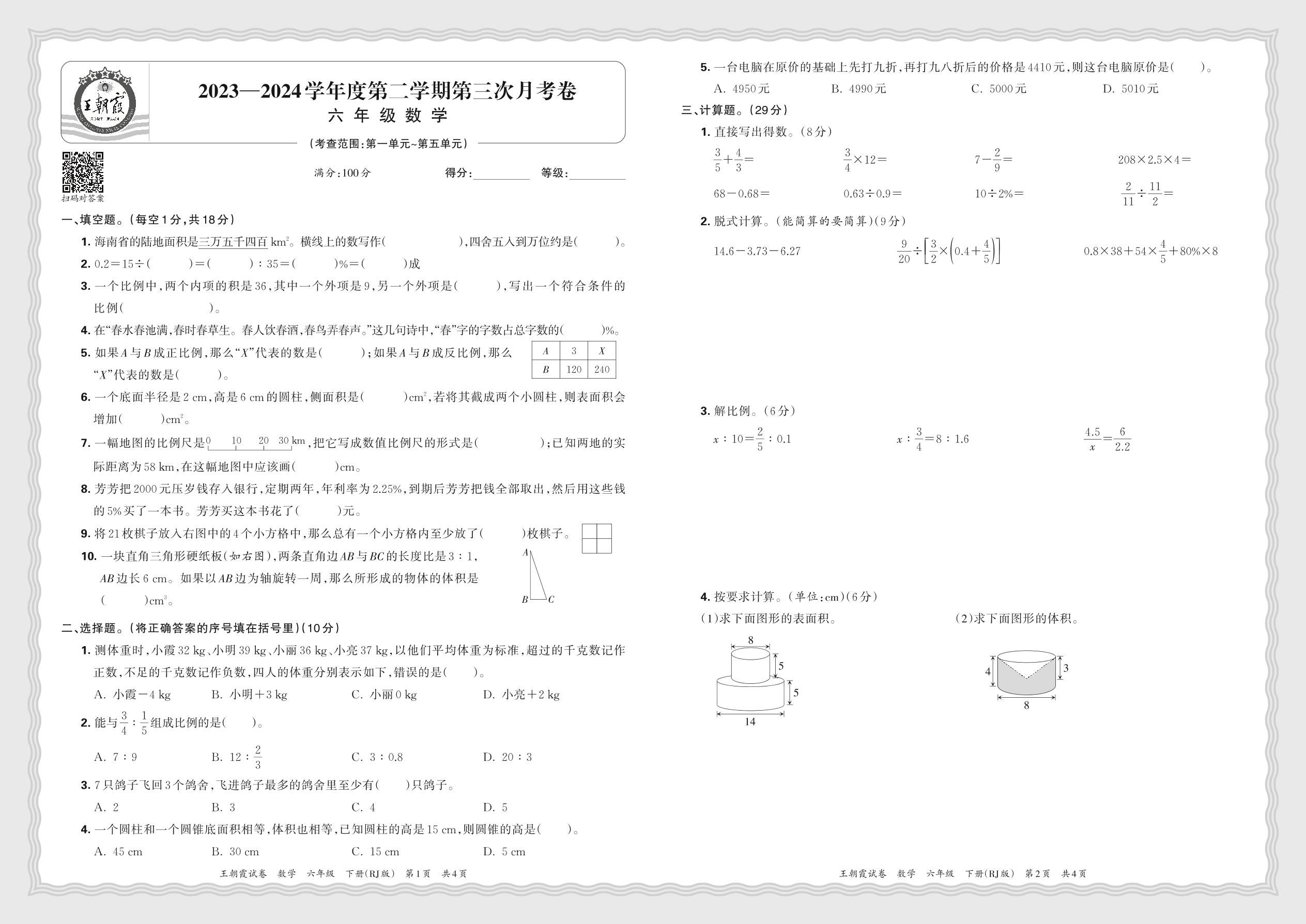 2023—2024学年度第二学期第三次月考卷六年级数学(人教版)