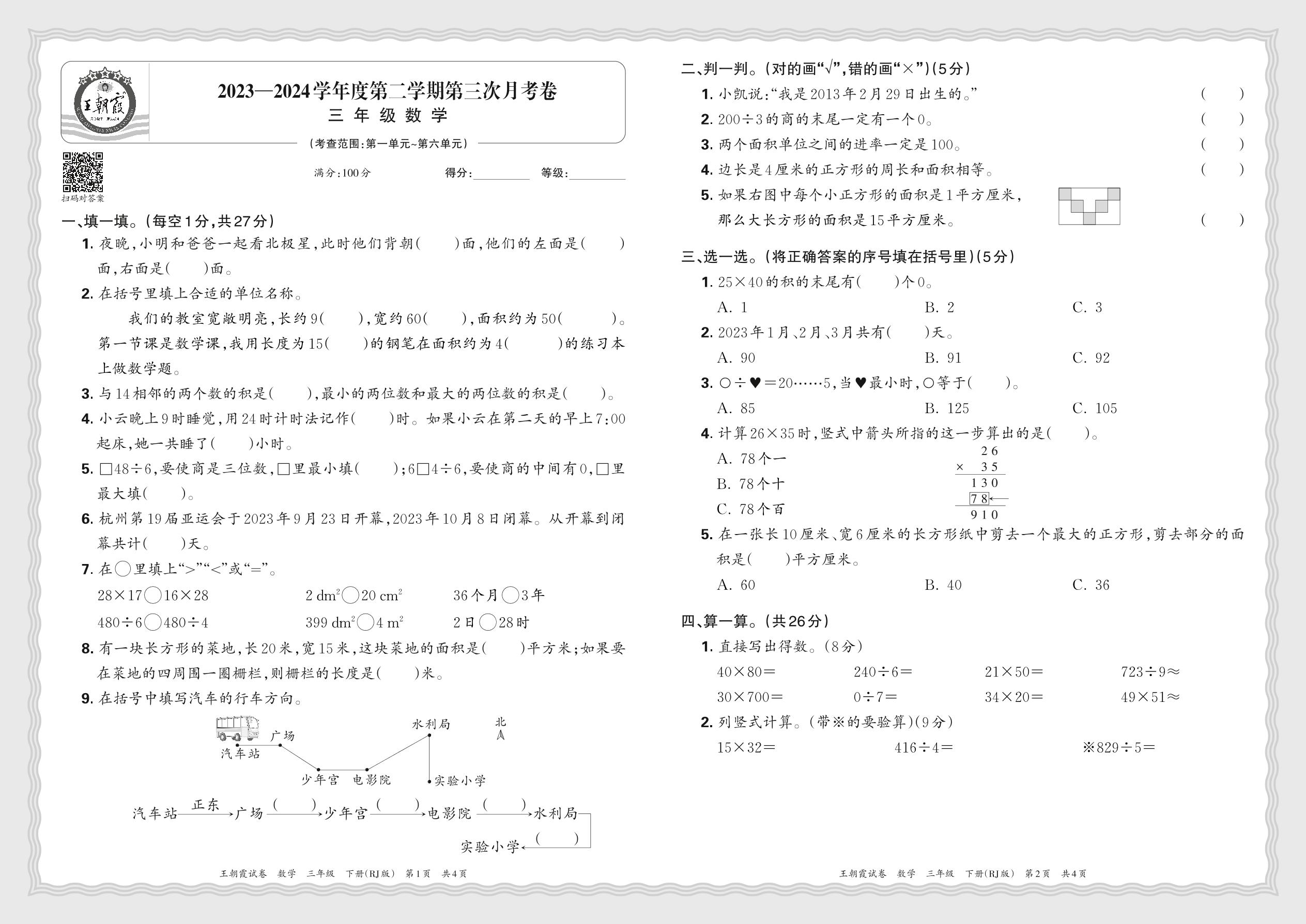2023—2024学年度第二学期第三次月考卷三年级数学(人教版)