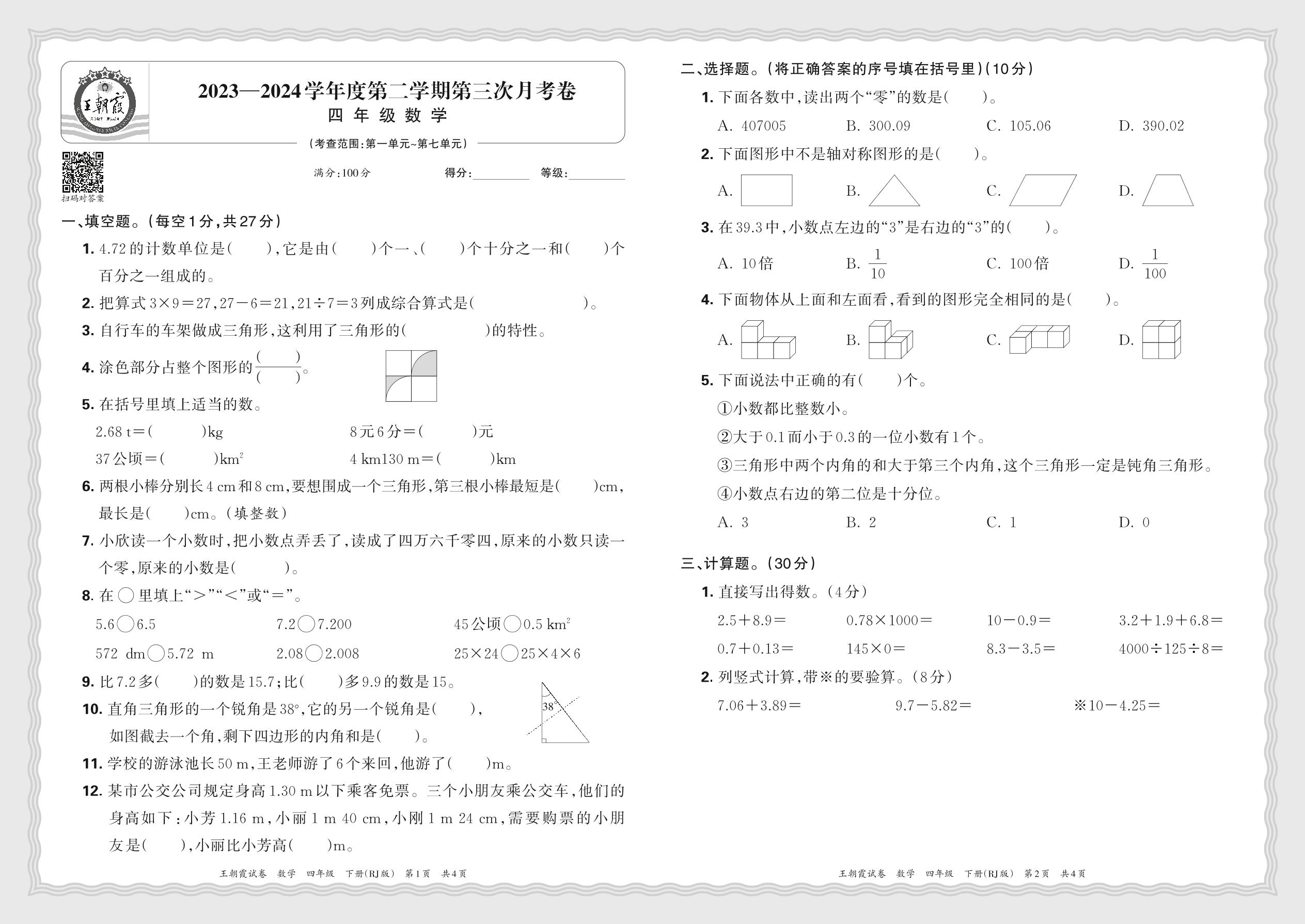 2023—2024学年度第二学期第三次月考卷四年级数学(人教版)