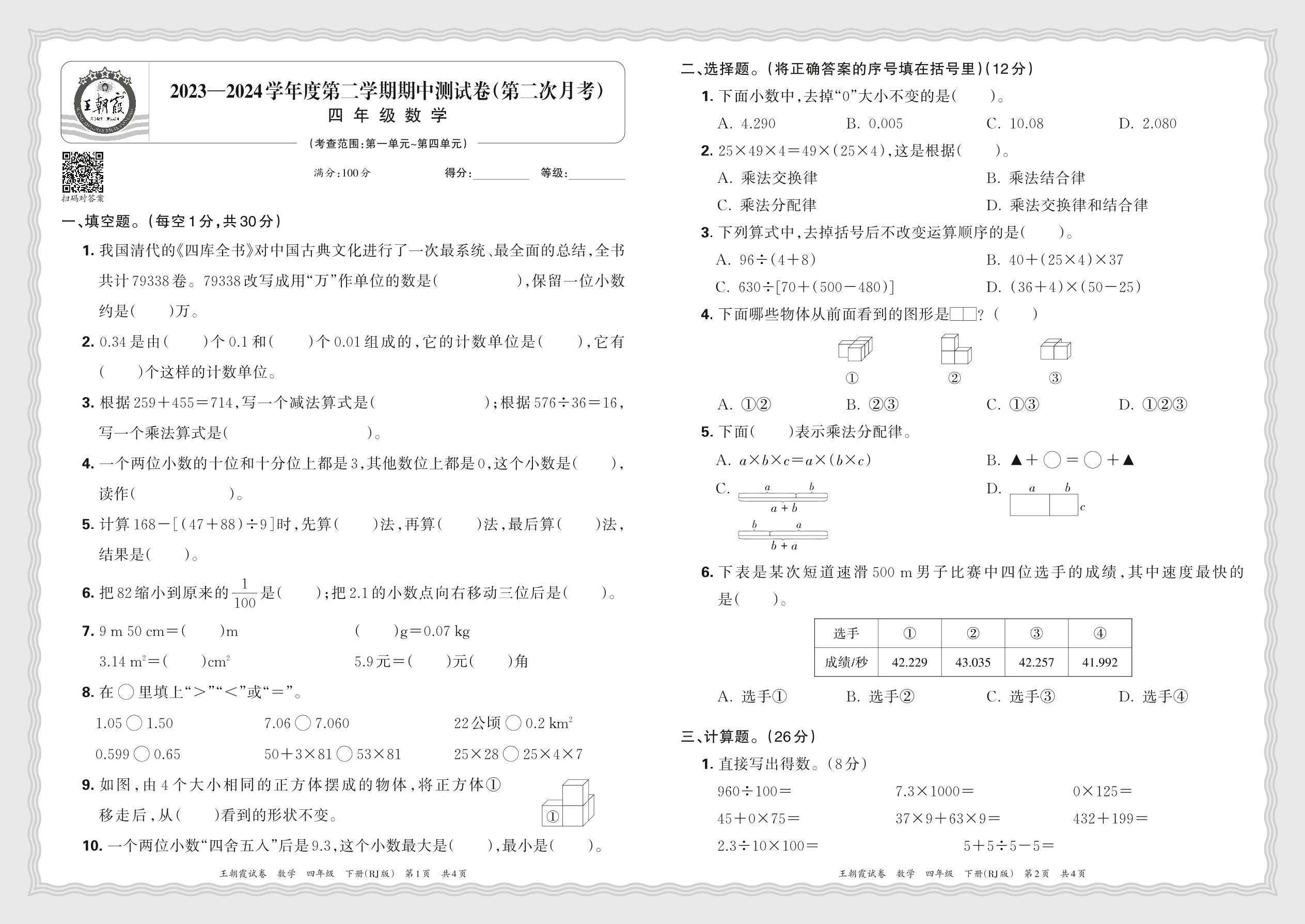 2023—2024学年度第二学期期中测试卷(第二次月考)四年级数学(人教版)