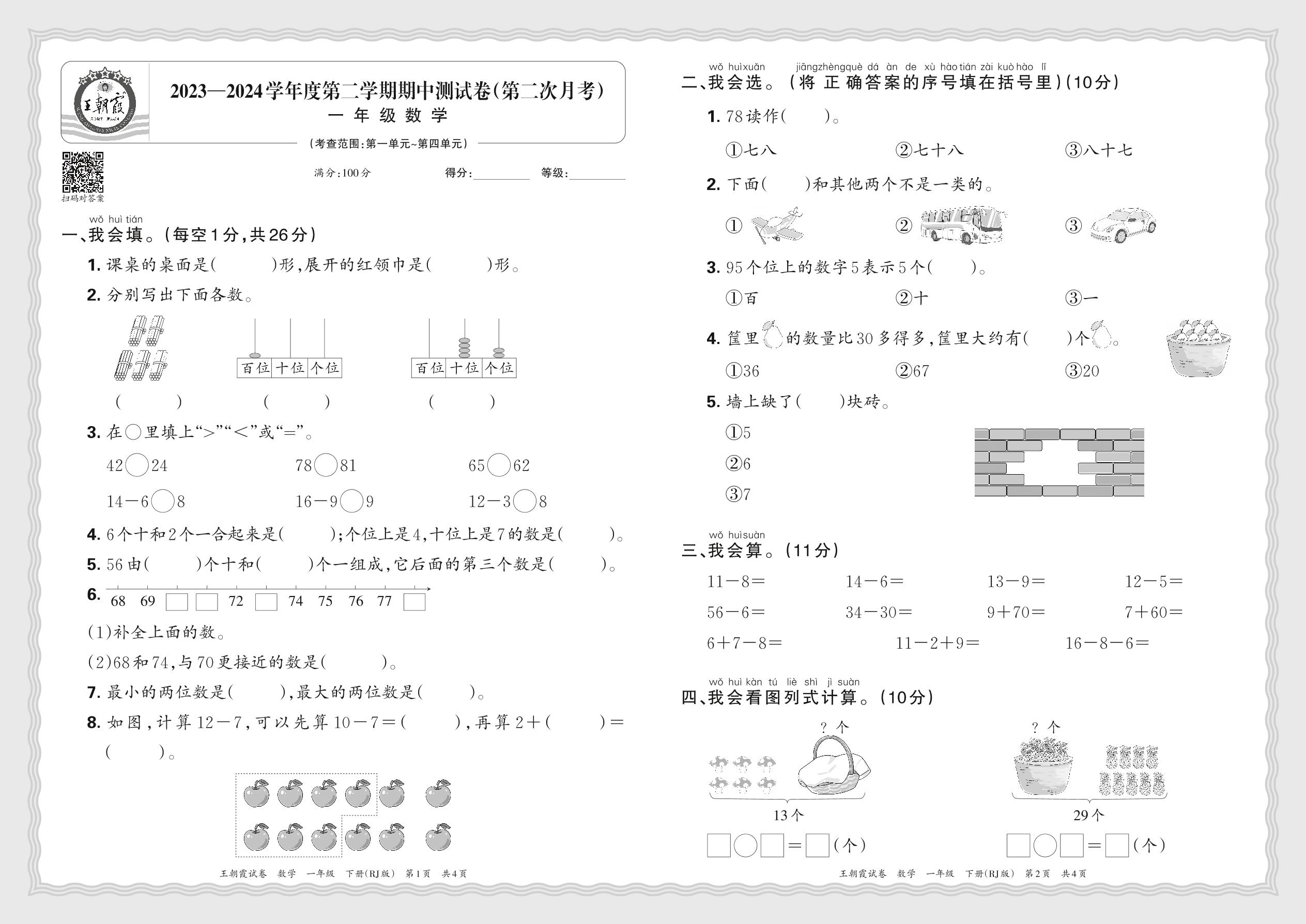 2023—2024学年度第二学期期中测试卷(第二次月考)一年级数学(人教版)