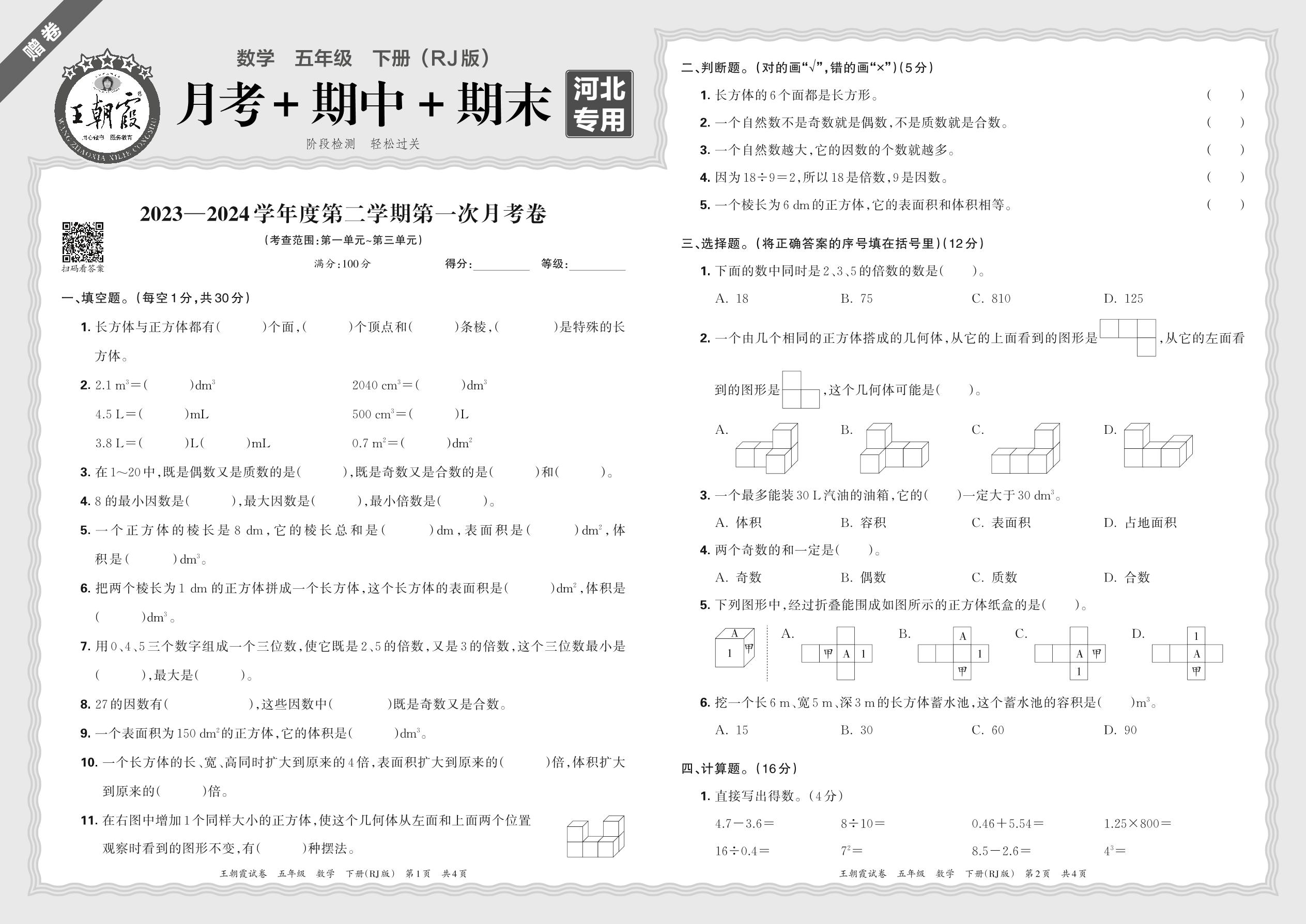 五年级数学人教版下册月考卷