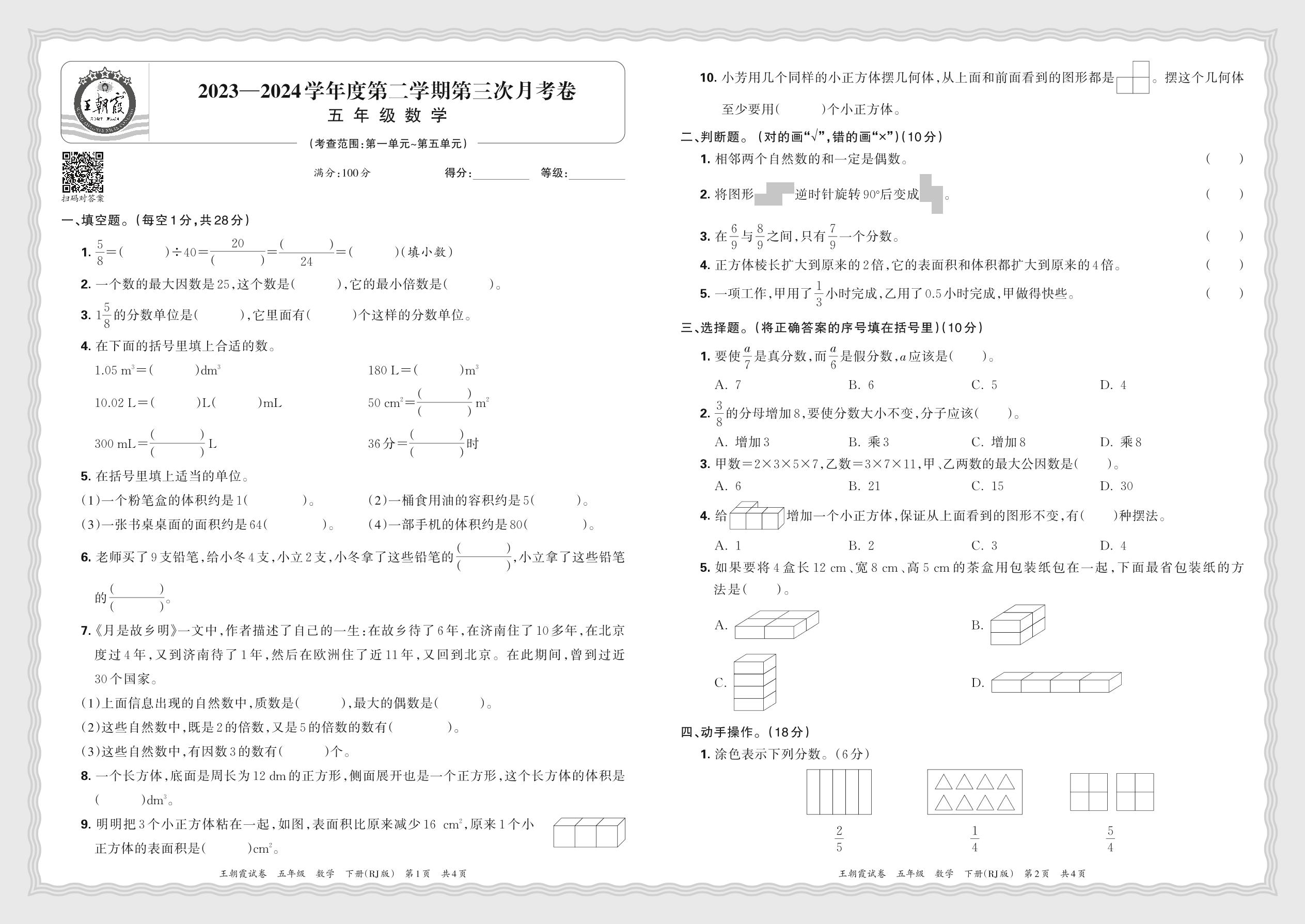 2023—2024学年度第二学期第三次月考卷五年级数学(人教版)