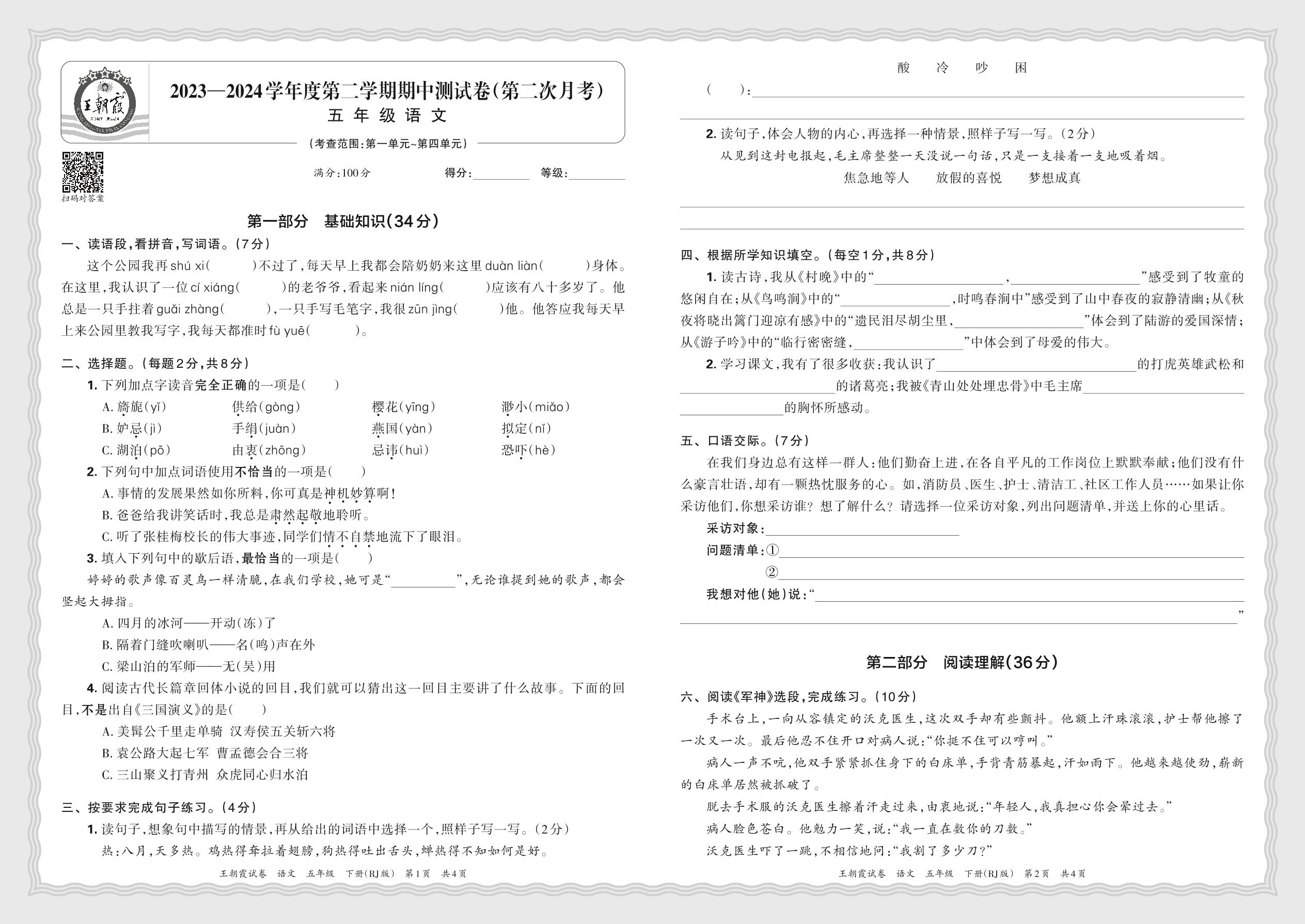 2023—2024学年度第二学期期中测试卷(第二次月考)五年级语文(人教版)