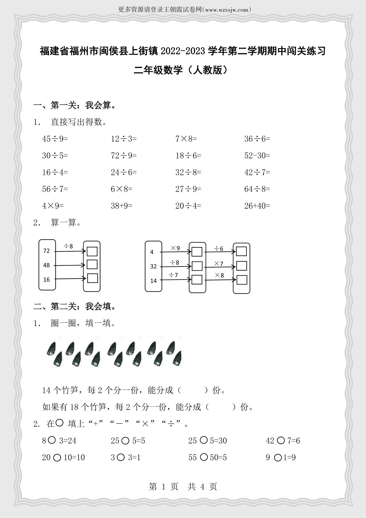 福建省福州市闽侯县上街镇2022-2023学年第二学期期中闯关练习二年级数学(人教版)