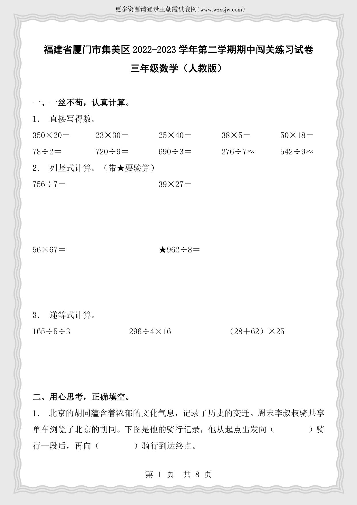 福建省厦门市集美区2022-2023学年第二学期期中闯关练习试卷三年级数学(人教版)