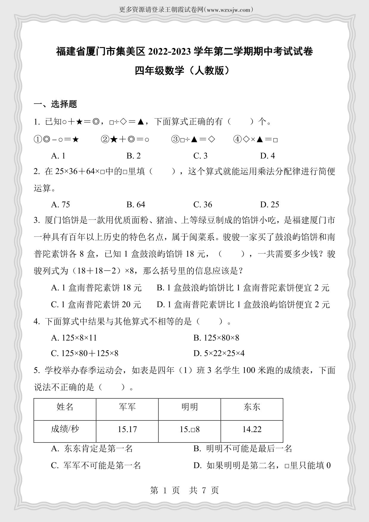 福建省厦门市集美区2022-2023学年第二学期期中考试试卷四年级数学(人教版)