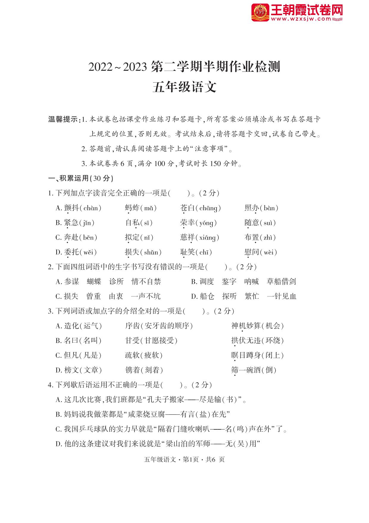 贵州省六盘水市盘州市2022-2023学年第二学期期中作业检测五年级语文(人教版)