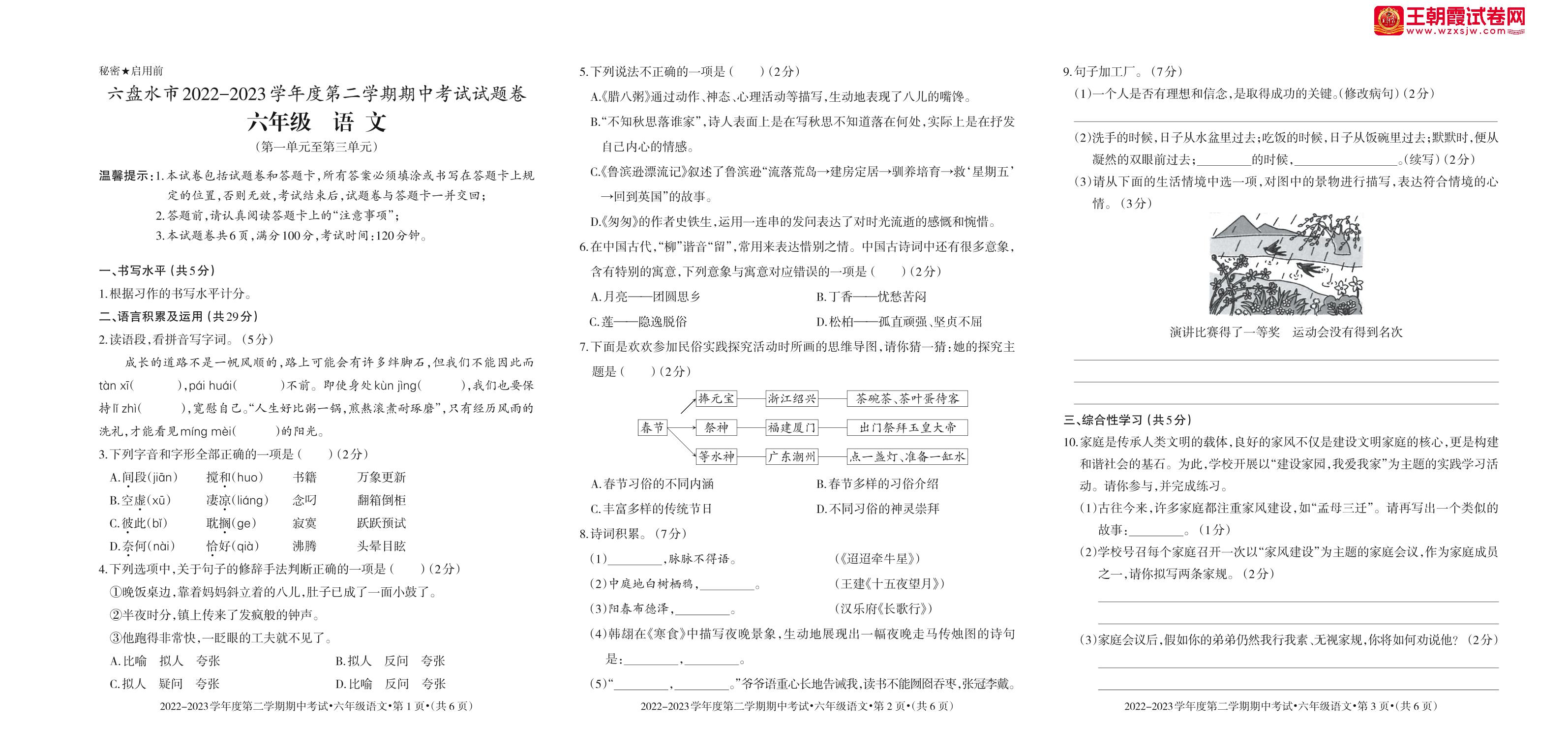 贵州省六盘水市2022-2023学年度第二学期期中考试六年级语文(人教版)