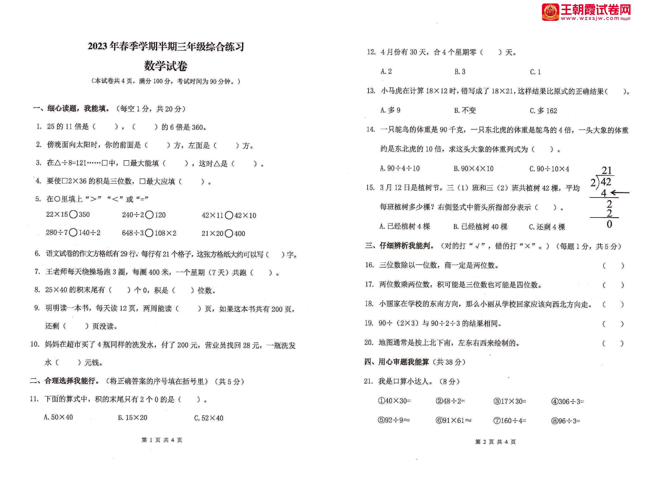 贵州省铜仁市松桃县2022-2023学年下学期期中综合练习三年级数学(人教版)