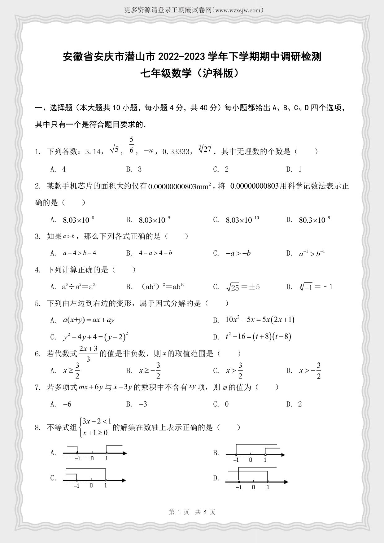 安徽省安庆市潜山市2022-2023学年下学期期中调研检测七年级数学(沪科版)