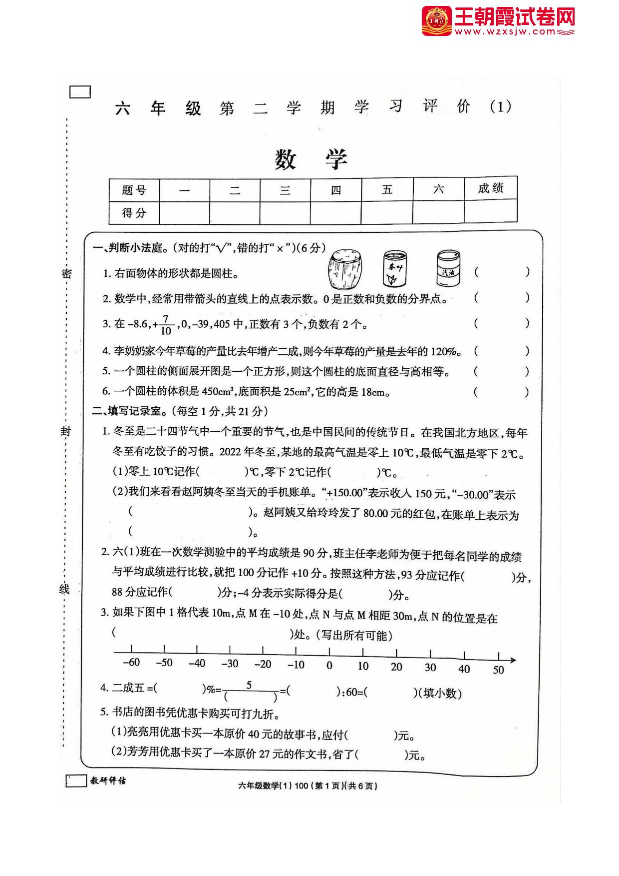六年级数学人教版下册月考卷