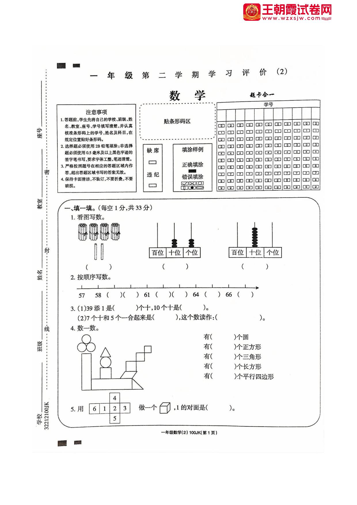 吉林省白城市通榆县第一大学区2022-2023学年下学期期中考试试卷一年级数学(人教版)